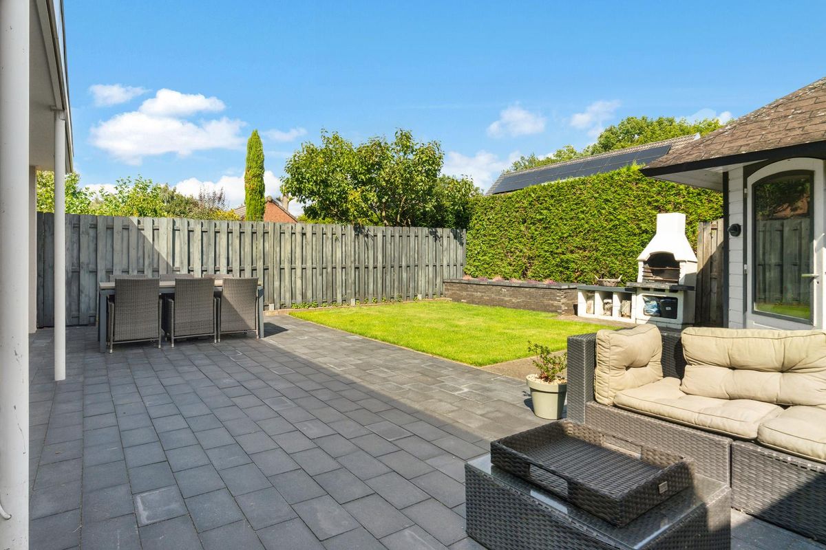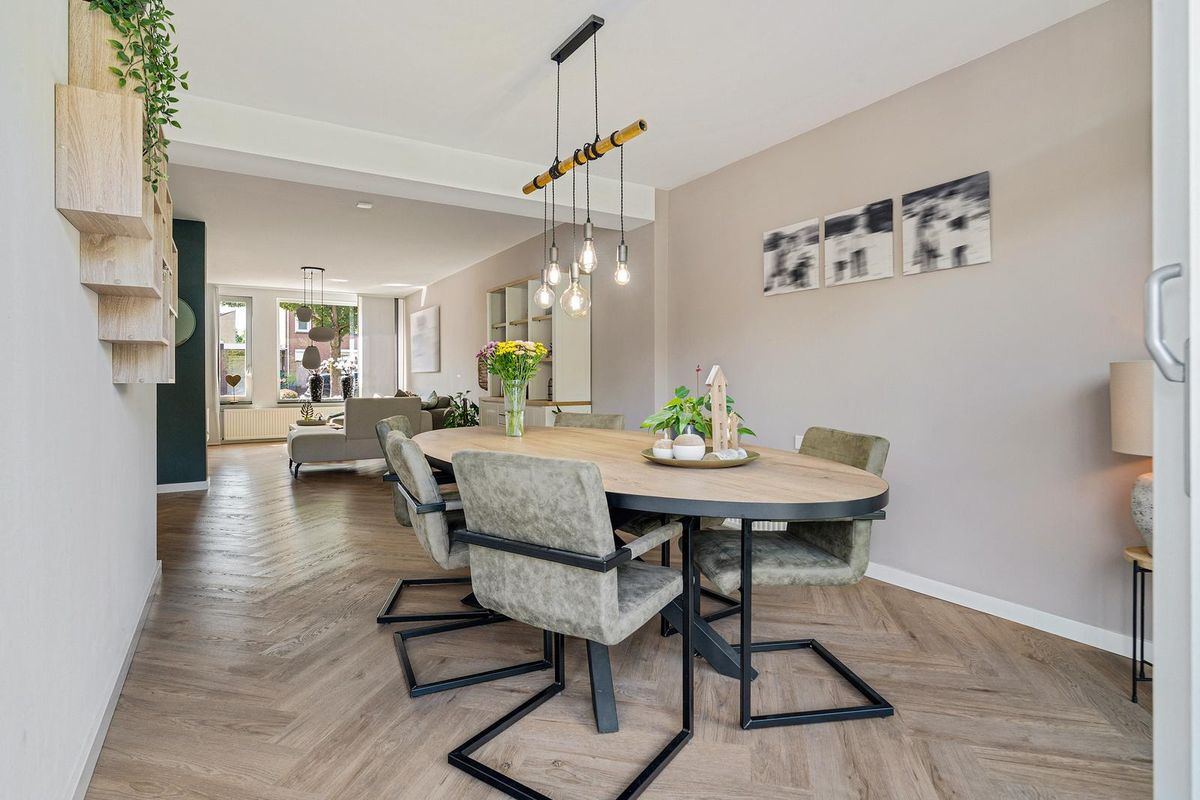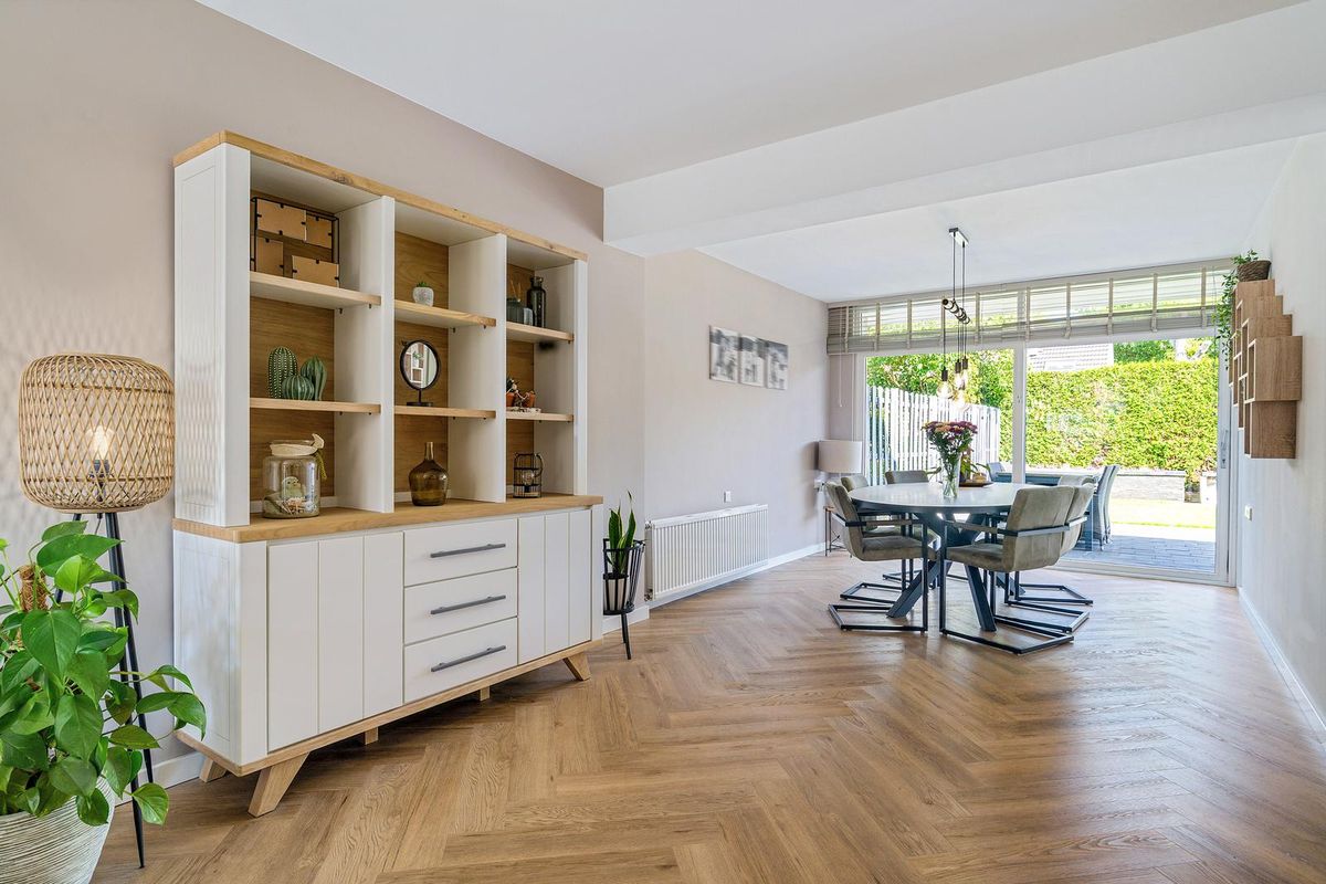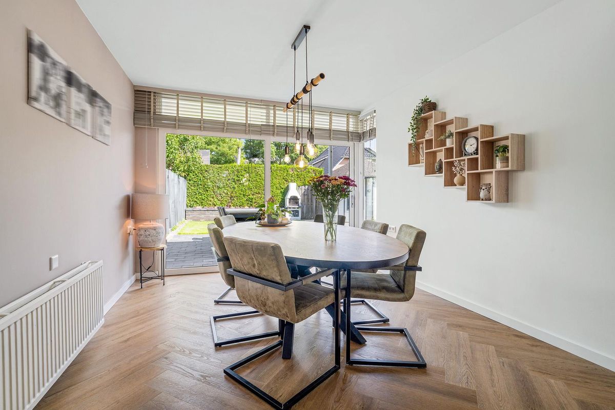 Dankzij de schuifpui in de eetkamer heeft u direct toegang tot de overdekte terrasruimte en de mooi aangelegde tuin.