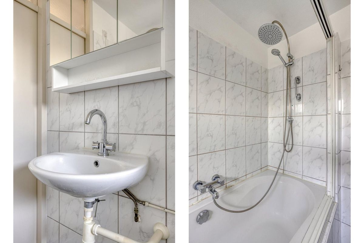 De badkamer (ca. 7 m2) heeft sanitaire voorzieningen zoals een ligbad met douchescherm en douche, wastafel, spiegel met spiegelkast, verlichting, hangend tweede toilet en de wasmachine- en drogeraansluiting. De badkamer is geheel betegeld in een lichte kleurstelling.