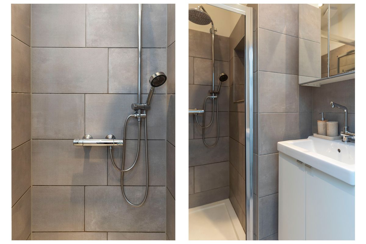 De badkamer is netjes betegeld en voorzien van een inloopdouche met glazen douchewand, hand- en regendouche, thermostaatkraan en een stijlvol wastafelmeubel met mengkraan en kastruimte. De spiegelkast maakt het geheel helemaal af!