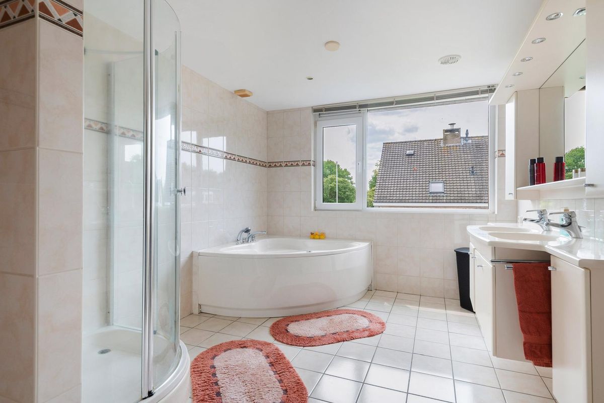 - Luxe badkamer van circa 12 m² met hoekligbad, douchecabine, wastafelmeubel en vloerverwarming;