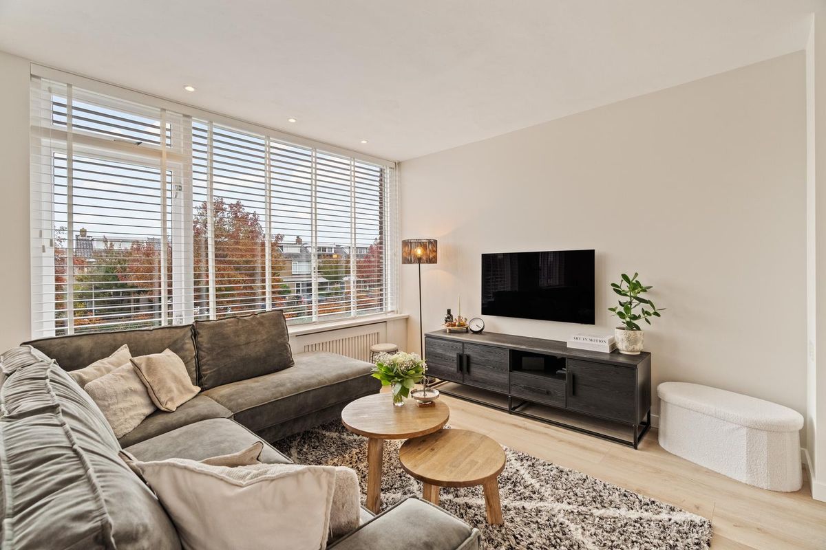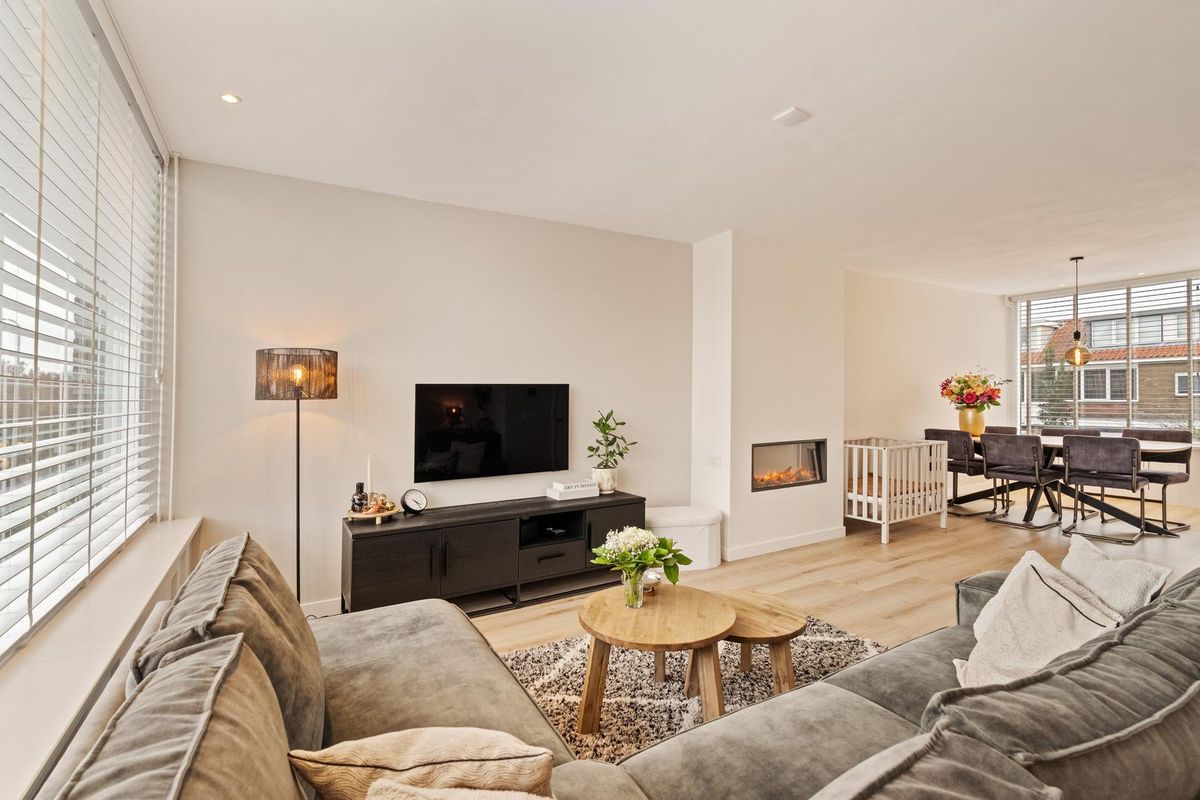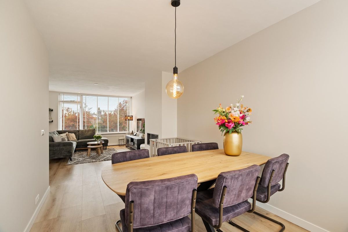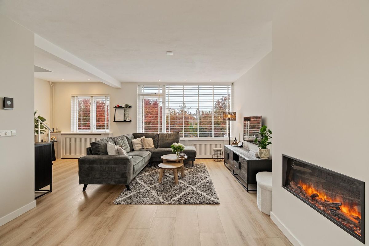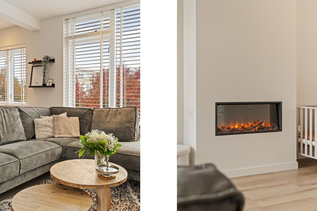 De royale woonkamer met eetgedeelte is heerlijk licht dankzij de vele ramen en heeft een prettige, open sfeer. Een elektrische sfeerhaard zorgt voor extra gezelligheid. Wanden en plafonds zijn strak gestuct en voorzien van sfeervolle inbouwspots. Vanuit de eetkamer is eveneens het balkon op het zuidoosten bereikbaar – een fijne plek om van de zon te genieten.