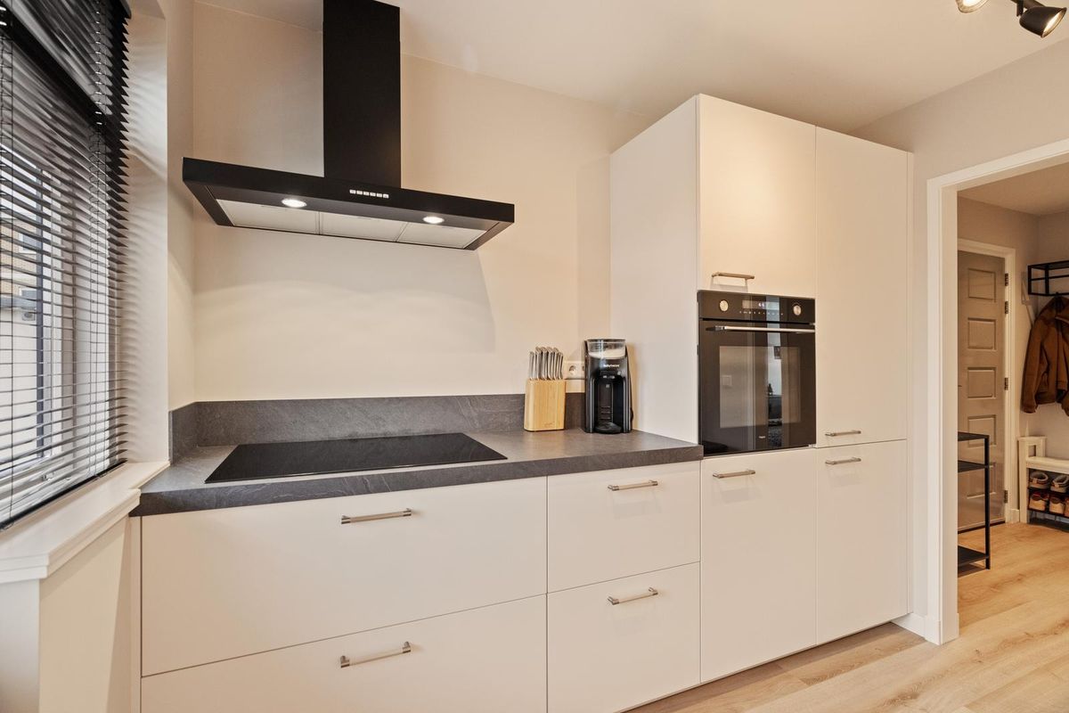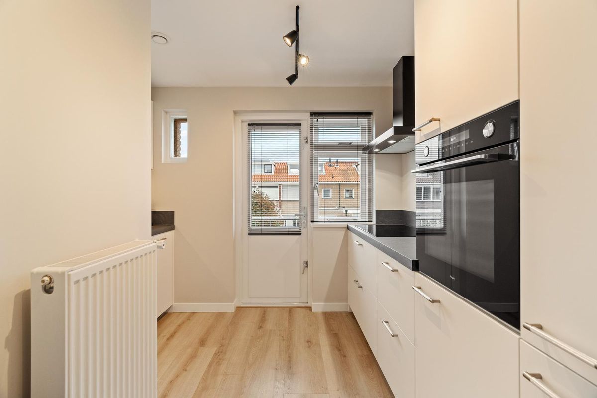De moderne keuken is uitgevoerd in een strakke opstelling en voorzien van diverse inbouwapparatuur, waaronder een inductiekookplaat, oven, afzuigkap, vaatwasser, Quooker, koelkast en vriezer. Vanuit de keuken is er toegang tot een zonnig balkon.