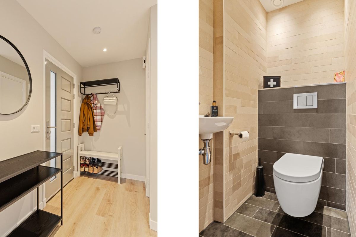 Entree, hal met garderoberuimte en meterkast. Luxe afgewerkt toilet met wandcloset en fonteintje.