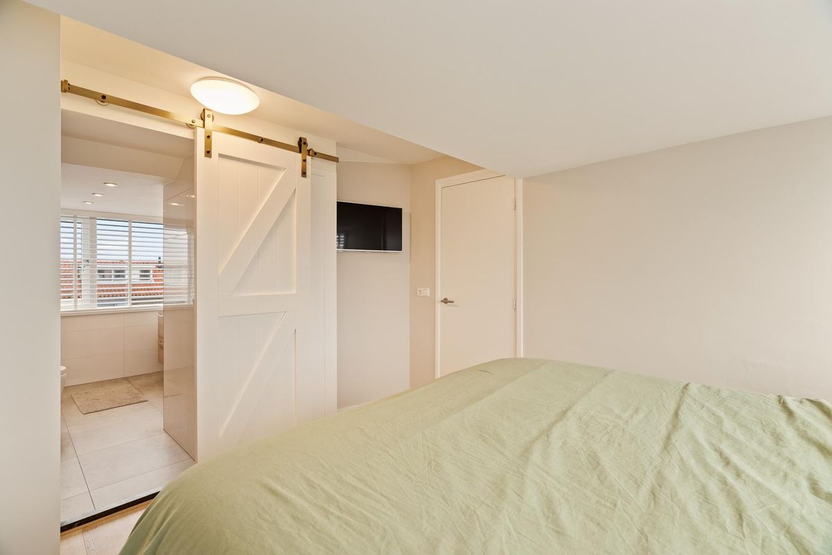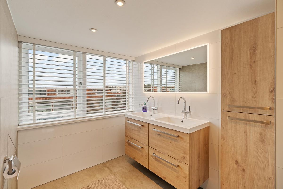 Er zijn twee grote slaapkamers, waarvan één direct toegang biedt tot de fraai afgewerkte badkamer. Deze luxe badkamer is voorzien van een inloop(regen)douche, een dubbel wastafelmeubel met spiegelverlichting en een tweede toilet.