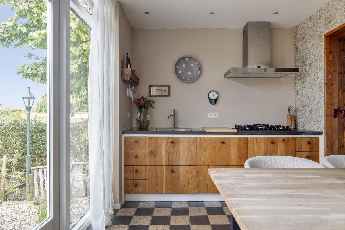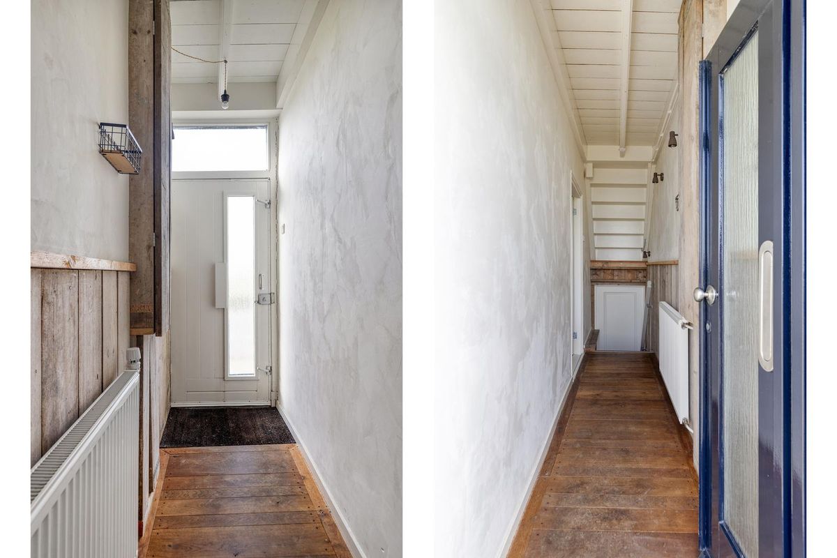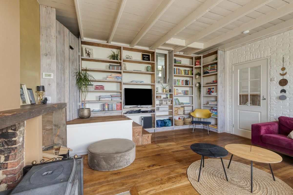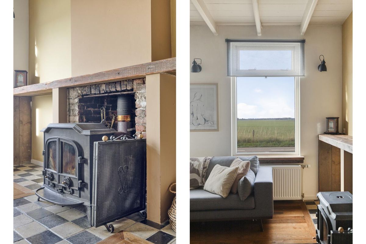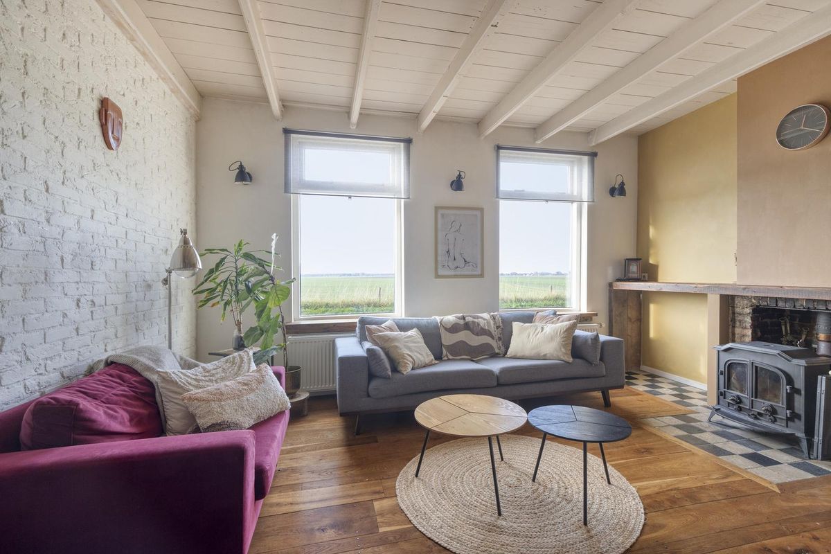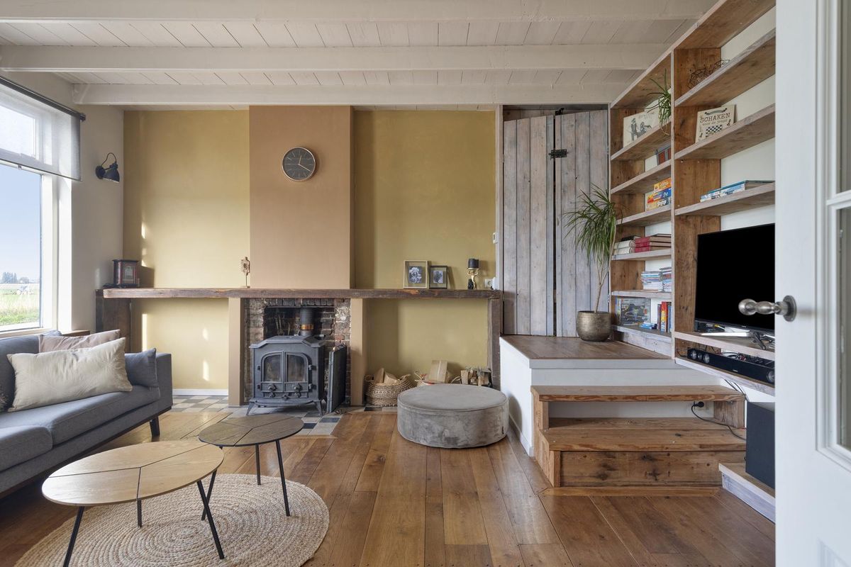 Via de dijk kom je binnenop de begane grond. Via entree kom je binnen in de hal, die toegang geeft tot zowel de woonkamer als het souterrain. De sfeervolle woonkamer is voorzien van een houtkachel en een verhoogd podium, wat een speels en knus effect geeft aan de ruimte. Een fijne plek om te ontspannen!