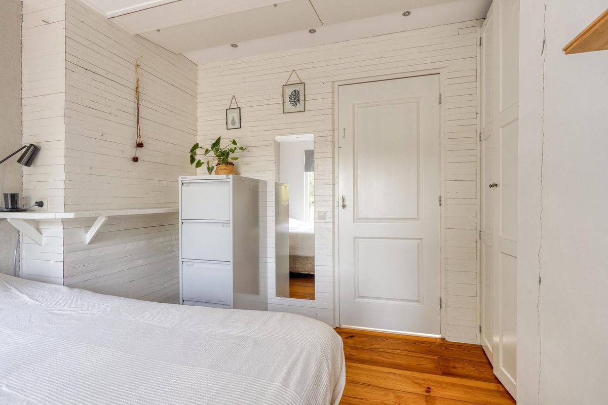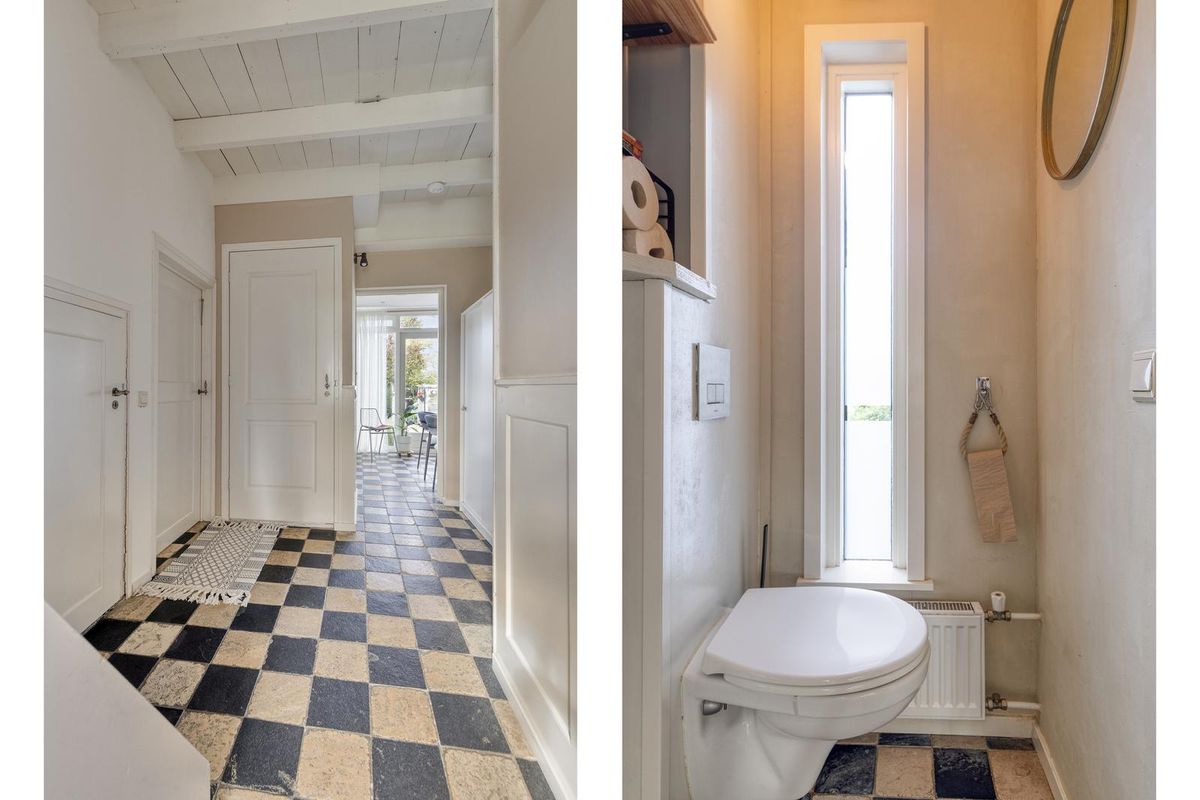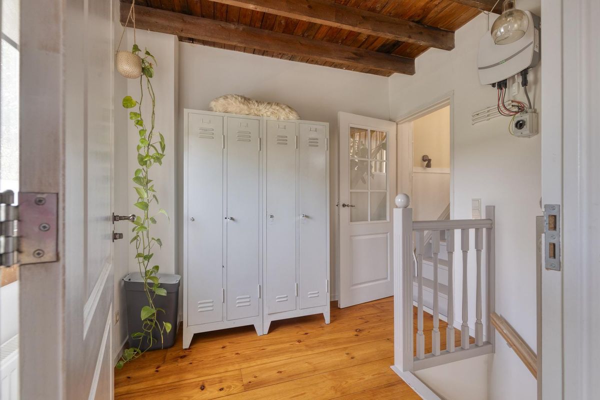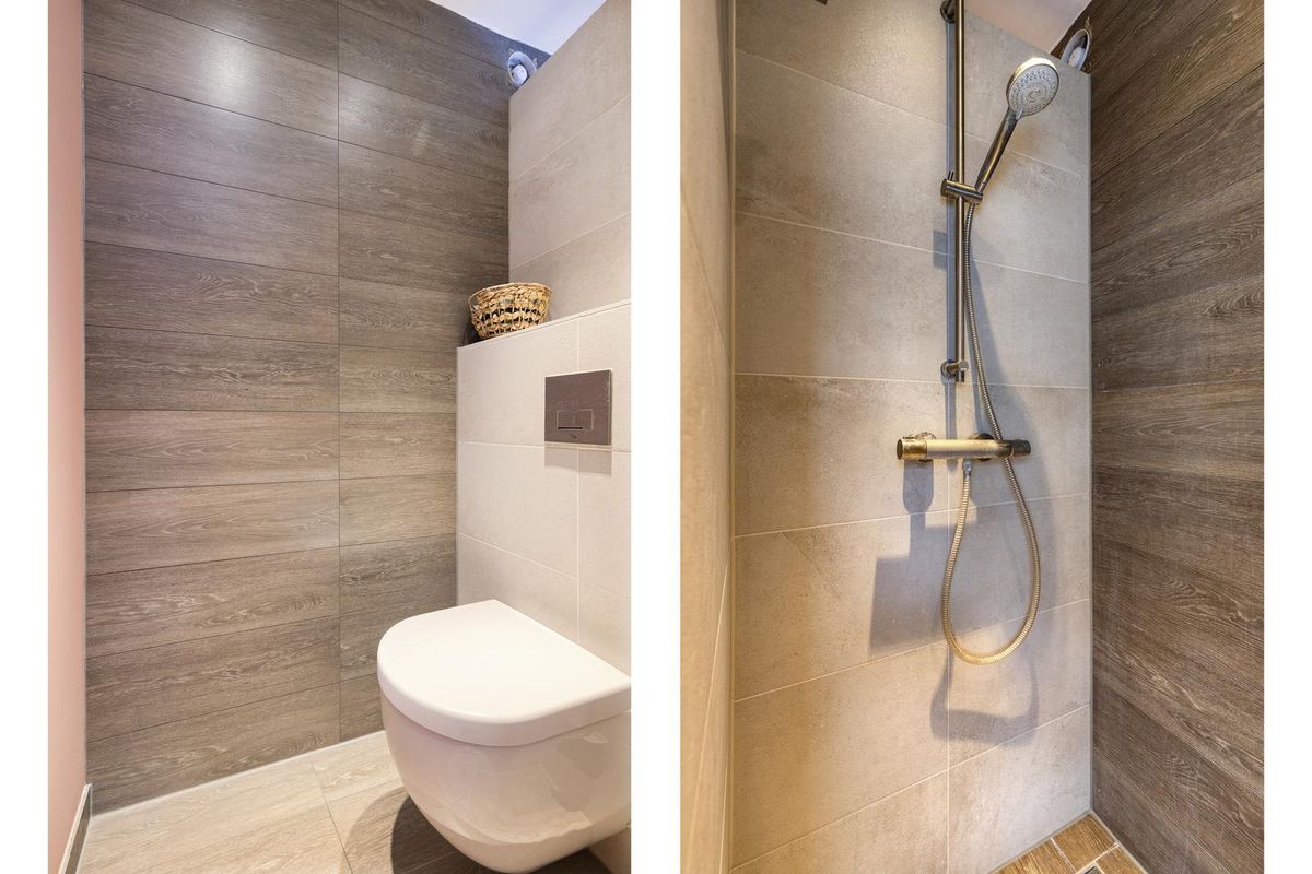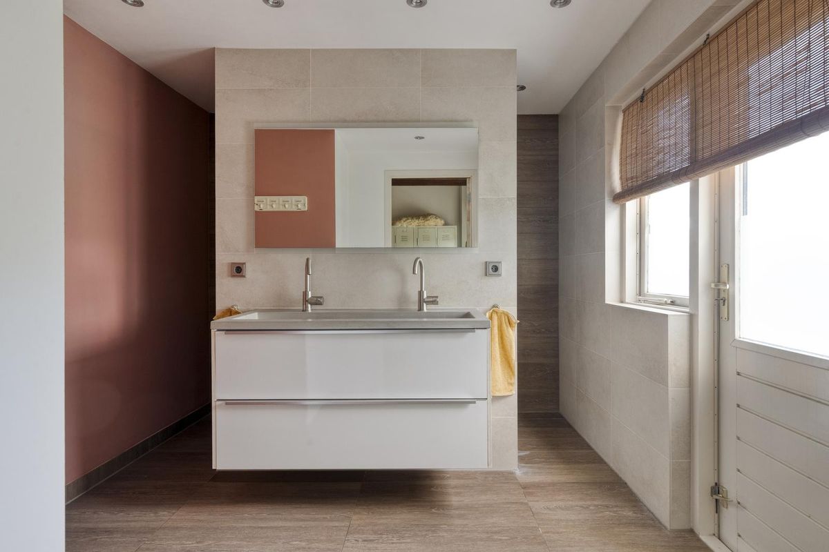Op de tussenverdieping bevindt zich de ruime badkamer, compleet met inloopdouche, dubbele wastafel en tweede toilet.
