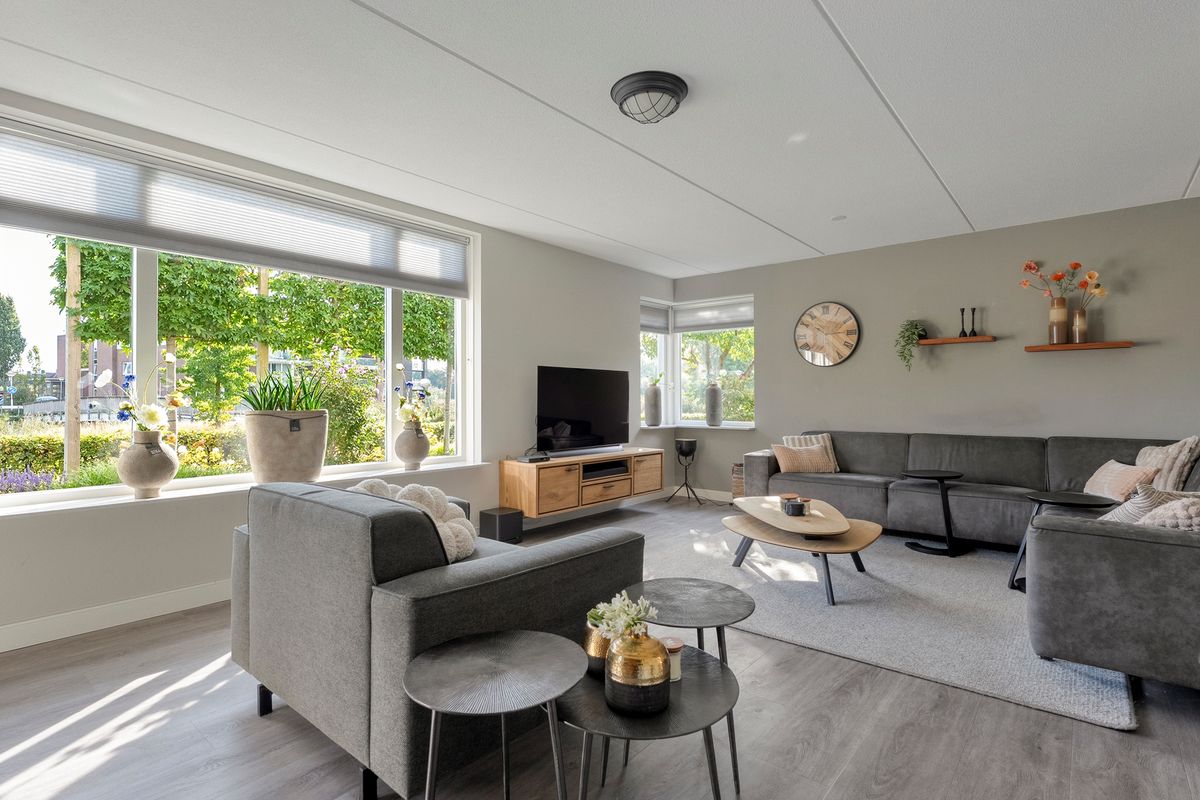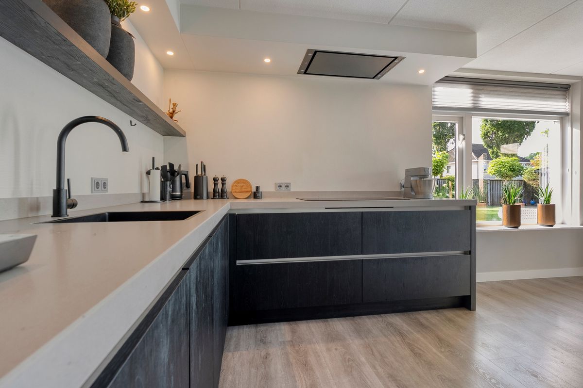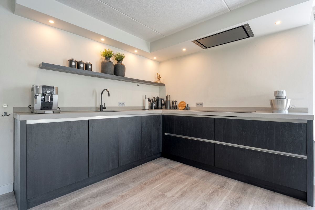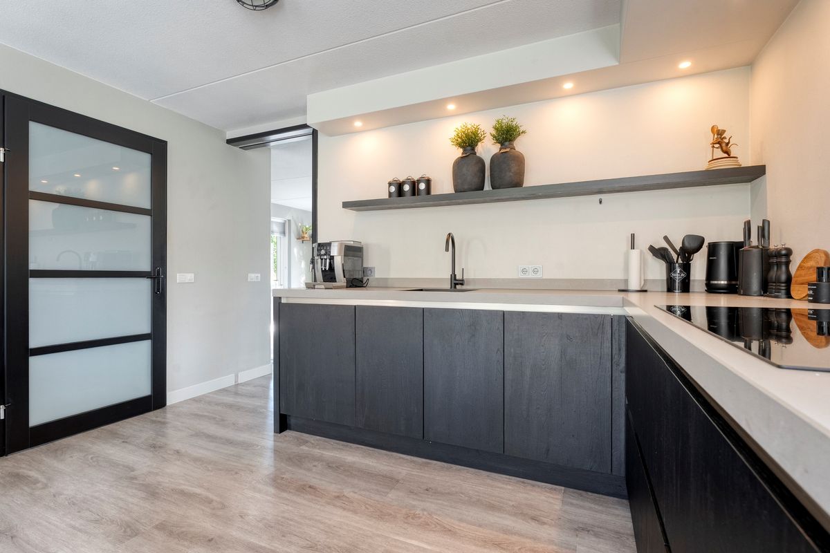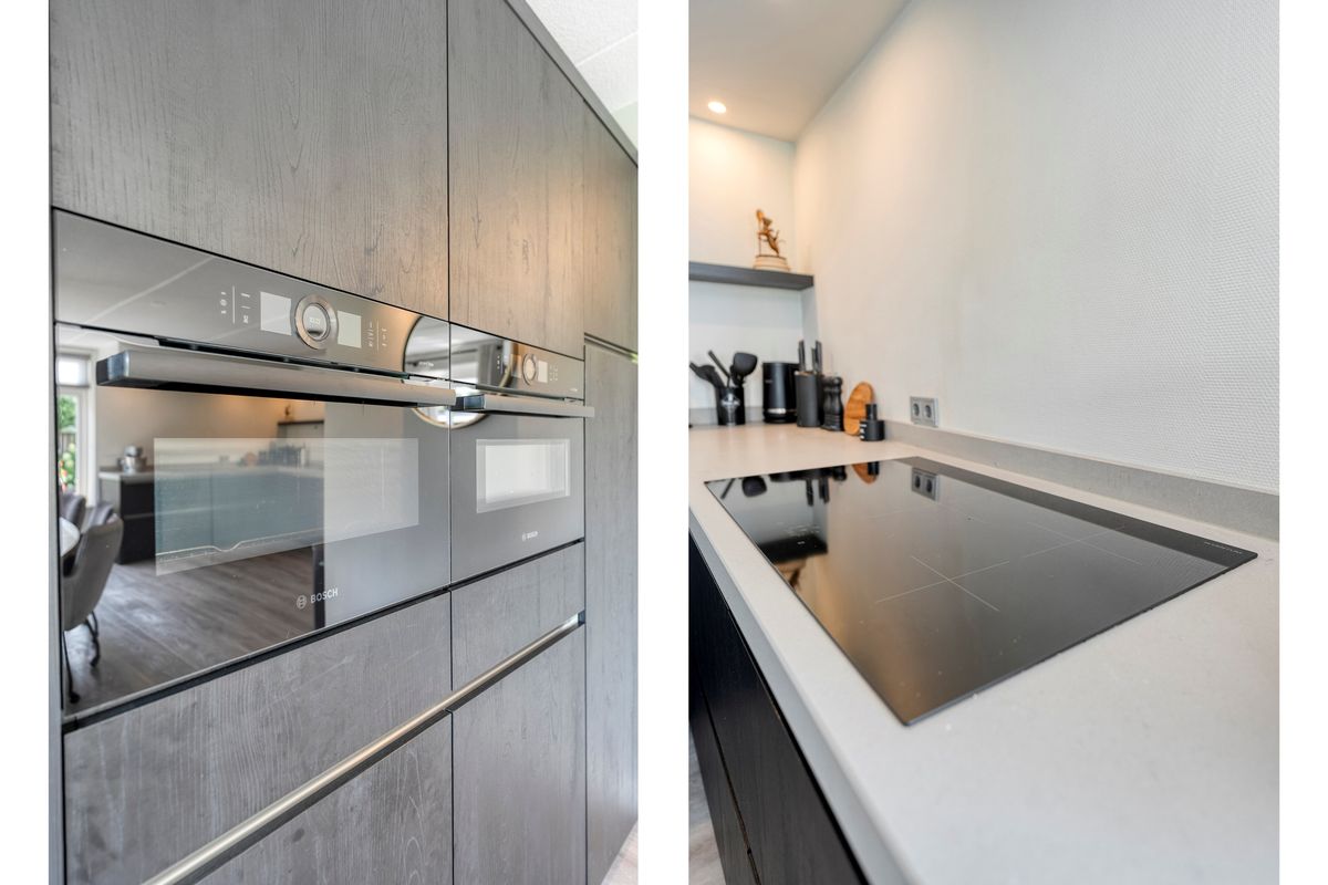 Via de overdekte entree kom je binnen in de hal, waar je de meterkast, het moderne hangtoilet en de trapopgang vindt. De royale, lichte woonkamer kijkt prachtig uit over het water en staat in open verbinding met de luxe keuken met airco. Deze is compleet ingericht met inbouwapparatuur van Bosch, waaronder een koelkast, vaatwasser, inductiekookplaat, oven, combi-oven én stoomoven. Dankzij de openslaande deuren loop je zo de achtertuin in, waar een fijn terras op je wacht.