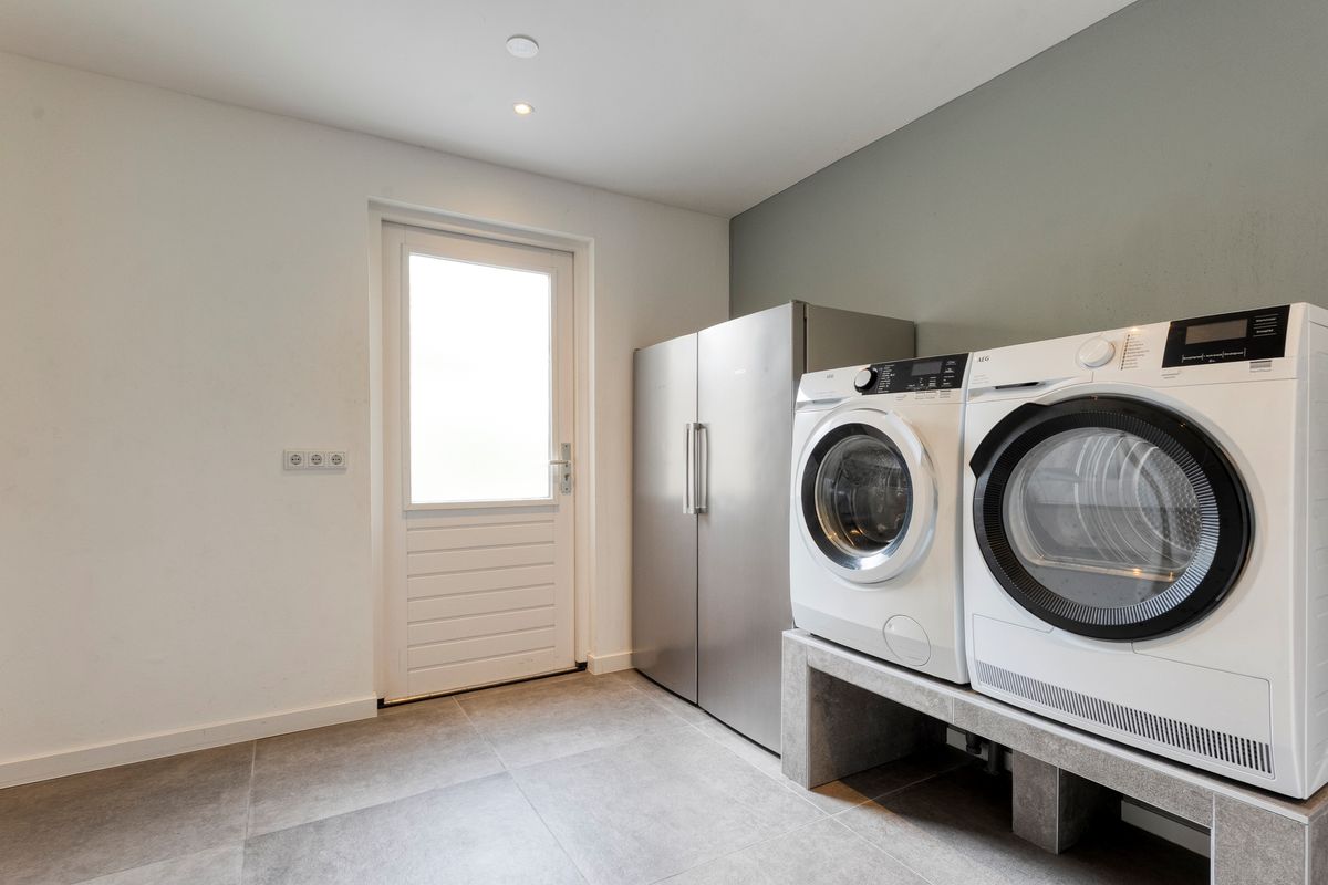 Direct naast de keuken bevindt zich de praktische berging met wasbak en aansluitingen voor zowel wasmachine als droger. Voor de woning ligt een brede oprit met ruimte om twee auto’s naast elkaar te parkeren. Daarnaast is er toegang tot zowel de garage als de woning zelf.