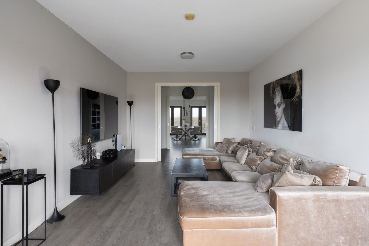 De woonkamer strekt zich uit over de volledige diepte van de woning. De grote raampartijen aan beide zijden zorgen voor een prachtige lichtinval. Terwijl je op de bank zit, kijk je vrij weg richting de skyline van Rotterdam. Het gevoel van ruimte is hier sterk: dit is duidelijk een plek om te ontspannen, te borrelen met vrienden of gewoon lekker tot rust te komen.