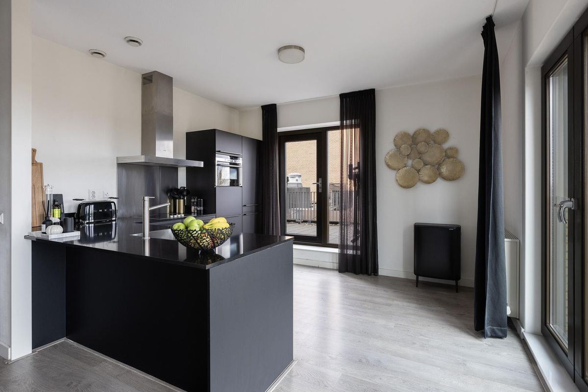 De keuken is ruim opgesteld in een U-vorm, volledig in stijl en met genoeg werkruimte. Een fijne plek voor wie van koken houdt of gewoon gezellig aan het kookeiland wil zitten met een koffie. Vanuit hier kijk je uit over het ruime terras aan de achterzijde en loop je er direct op uit.