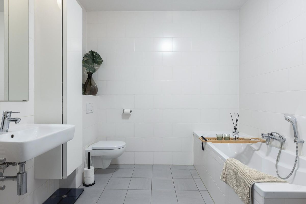 Een ruime badkamer met zowel een ligbad als aparte douche, plus wastafel en toilet. Helemaal netjes en functioneel. Naast de badkamer bevindt zich een aparte wasruimte: heel praktisch en netjes weggewerkt.