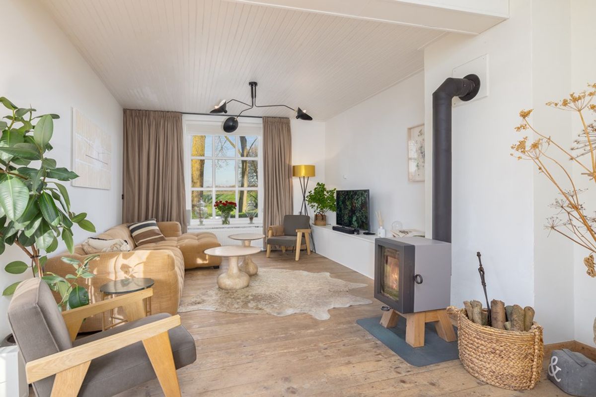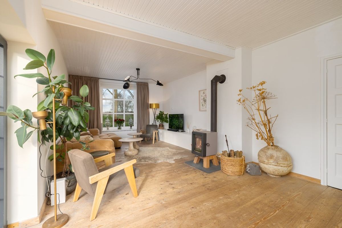 De woonkamer is licht, rustig en sfeervol, met een prettige maatvoering en een open uitstraling. Grote raampartijen zorgen voor een royale lichtinval en bieden een vrij uitzicht op het omliggende groen en het Maaslandschap. De houten vloer en het witte balkenplafond benadrukken het authentieke karakter van de woonboerderij, terwijl de afwerking eigentijds en ingetogen is.