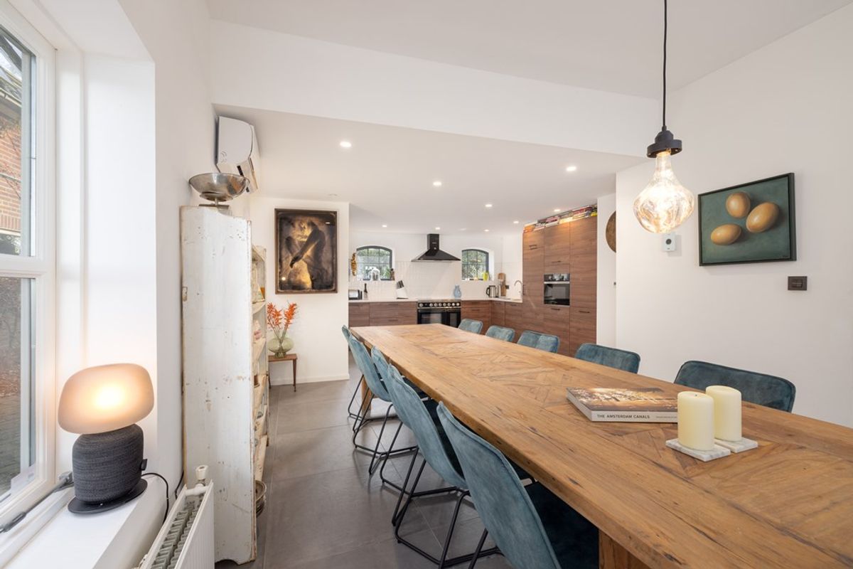 De royale woonkeuken met eetkamer vormt het hart van de woonboerderij. Deze lichte en uitnodigende leefruimte is in 2021 volledig vernieuwd en voorzien van een open keuken met kookeiland, uitgevoerd met maatwerkkasten en hoogwaardige inbouwapparatuur. De warme houttinten en rustige afwerking zorgen voor een tijdloze en hoogwaardige uitstraling.