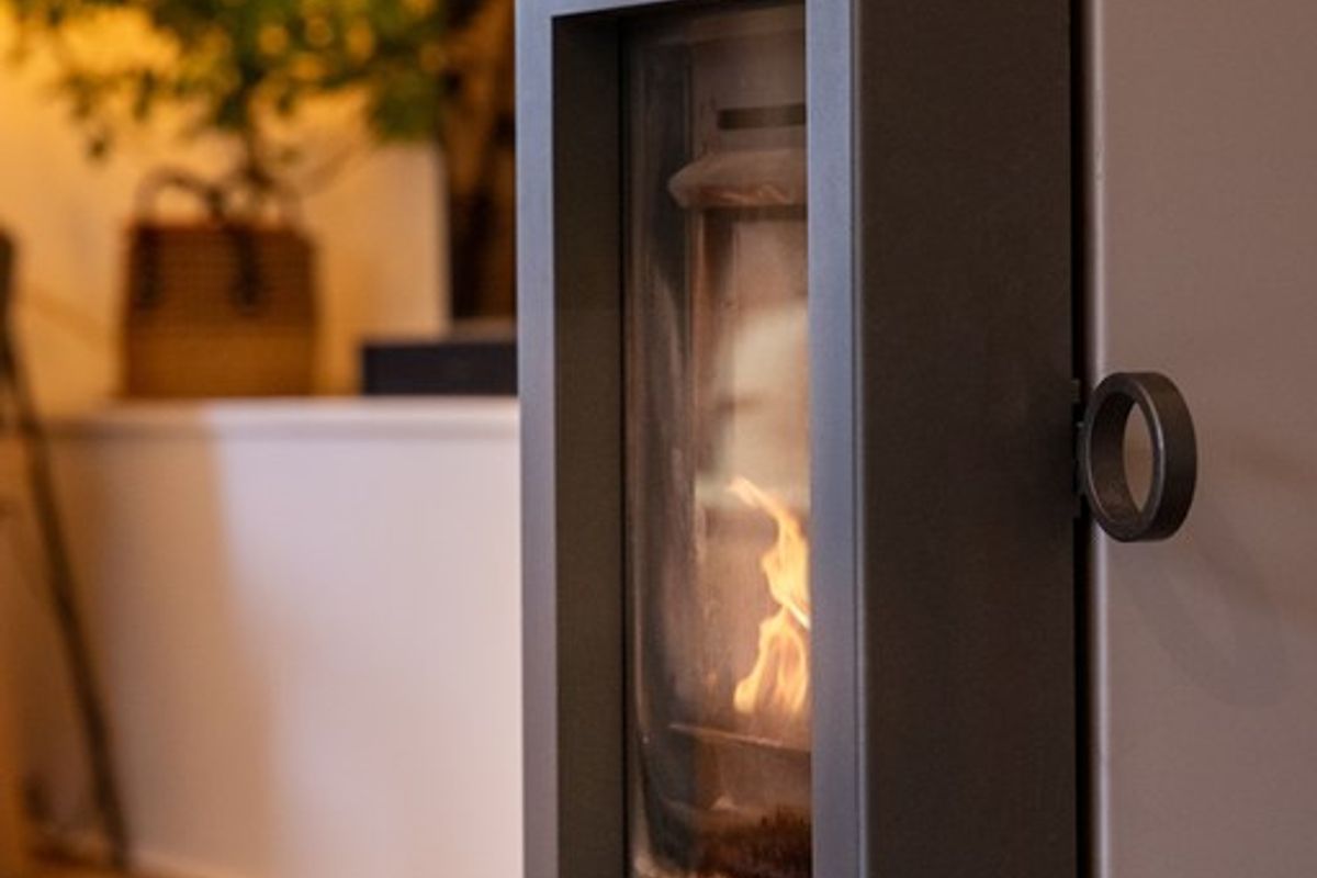 Centraal in de ruimte staat de houtkachel, die niet alleen warmte biedt maar ook bijdraagt aan de sfeer en het comfort. Via de openslaande deuren is er direct toegang tot de tuin, waardoor binnen en buiten op natuurlijke wijze in elkaar overlopen. Een aangename leefruimte voor elk seizoen, waarin rust, licht en uitzicht centraal staan.