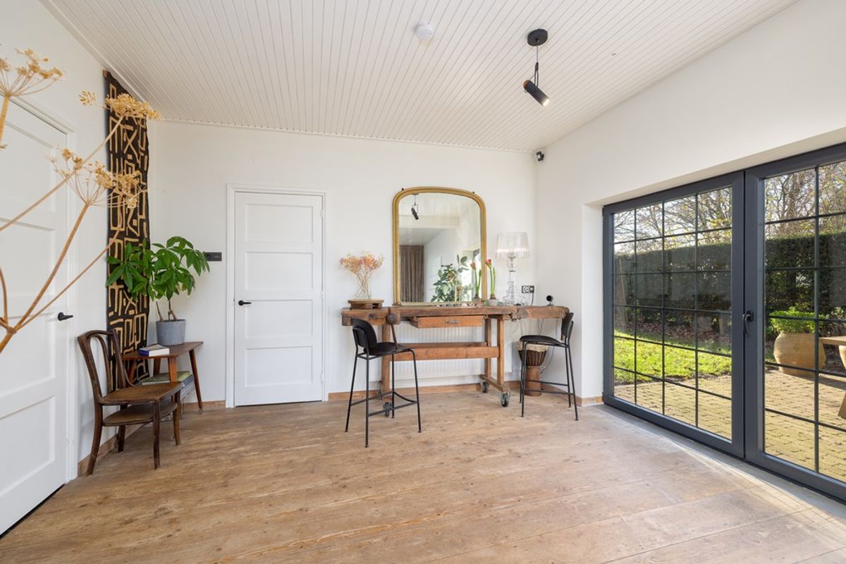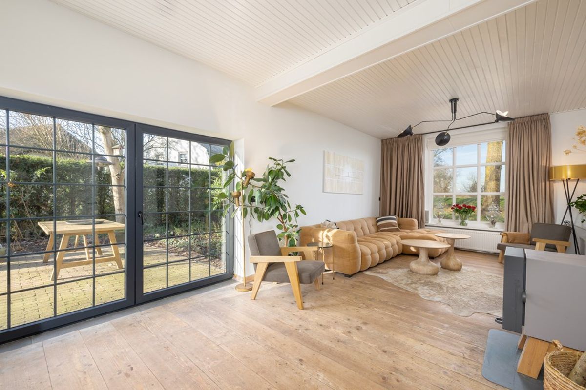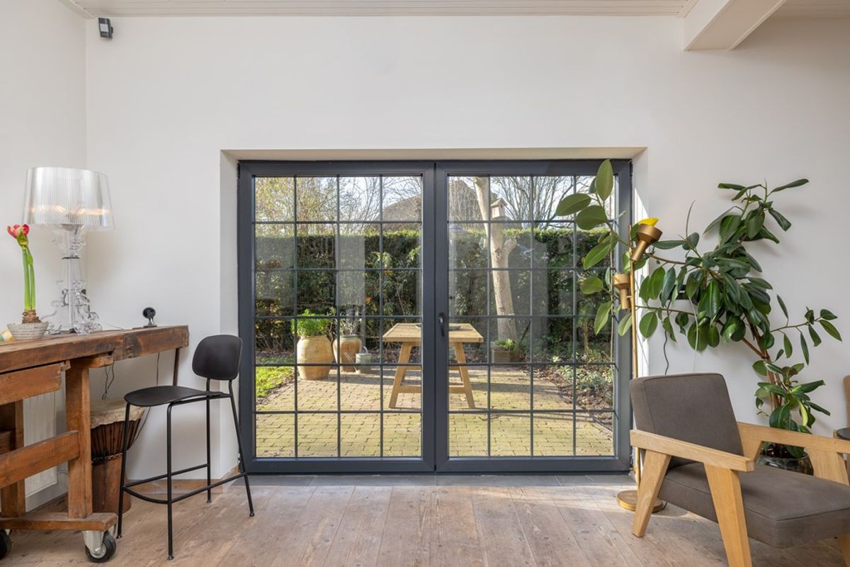 Via de openslaande deuren loop je direct de tuin in, waardoor binnen en buiten naadloos in elkaar overlopen. Een comfortabele en uitnodigende leefruimte voor elk seizoen.