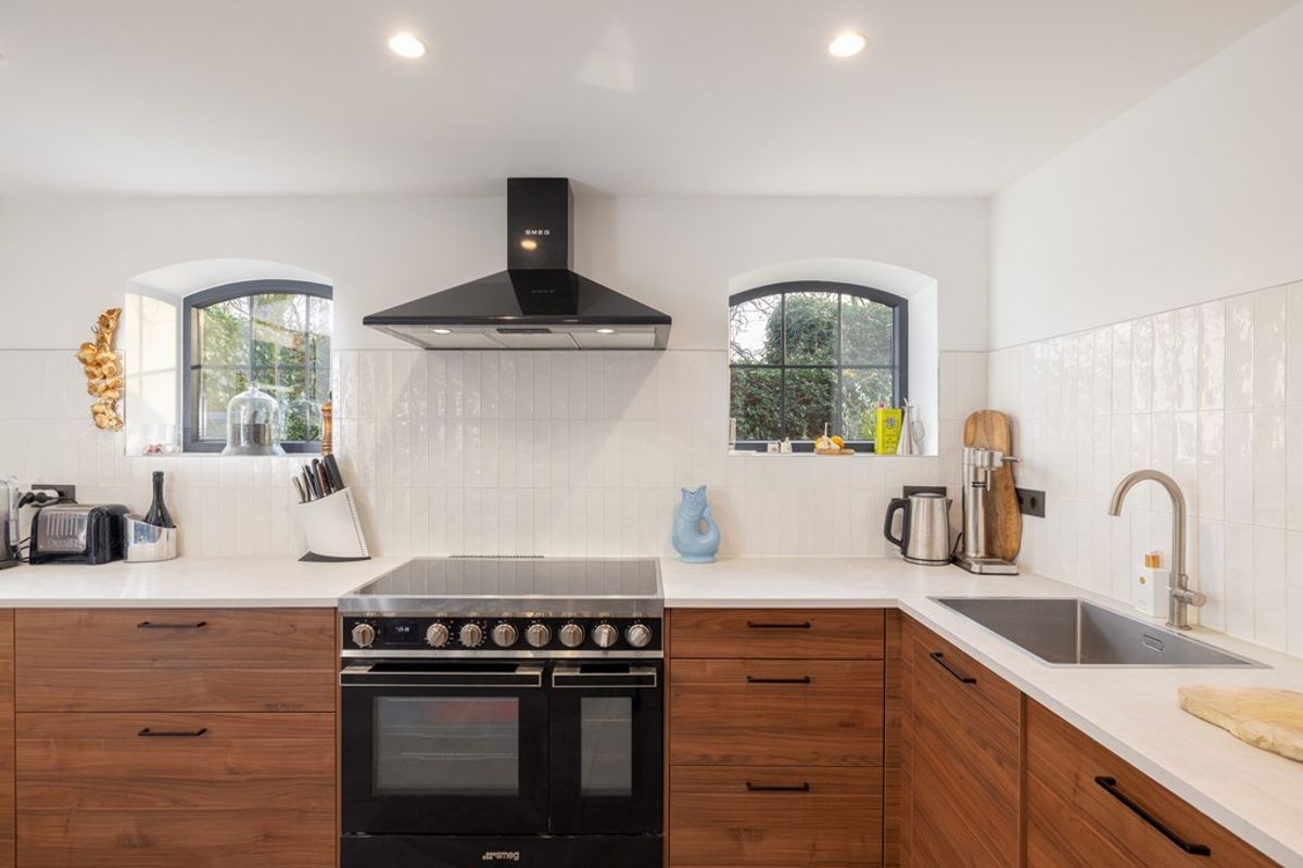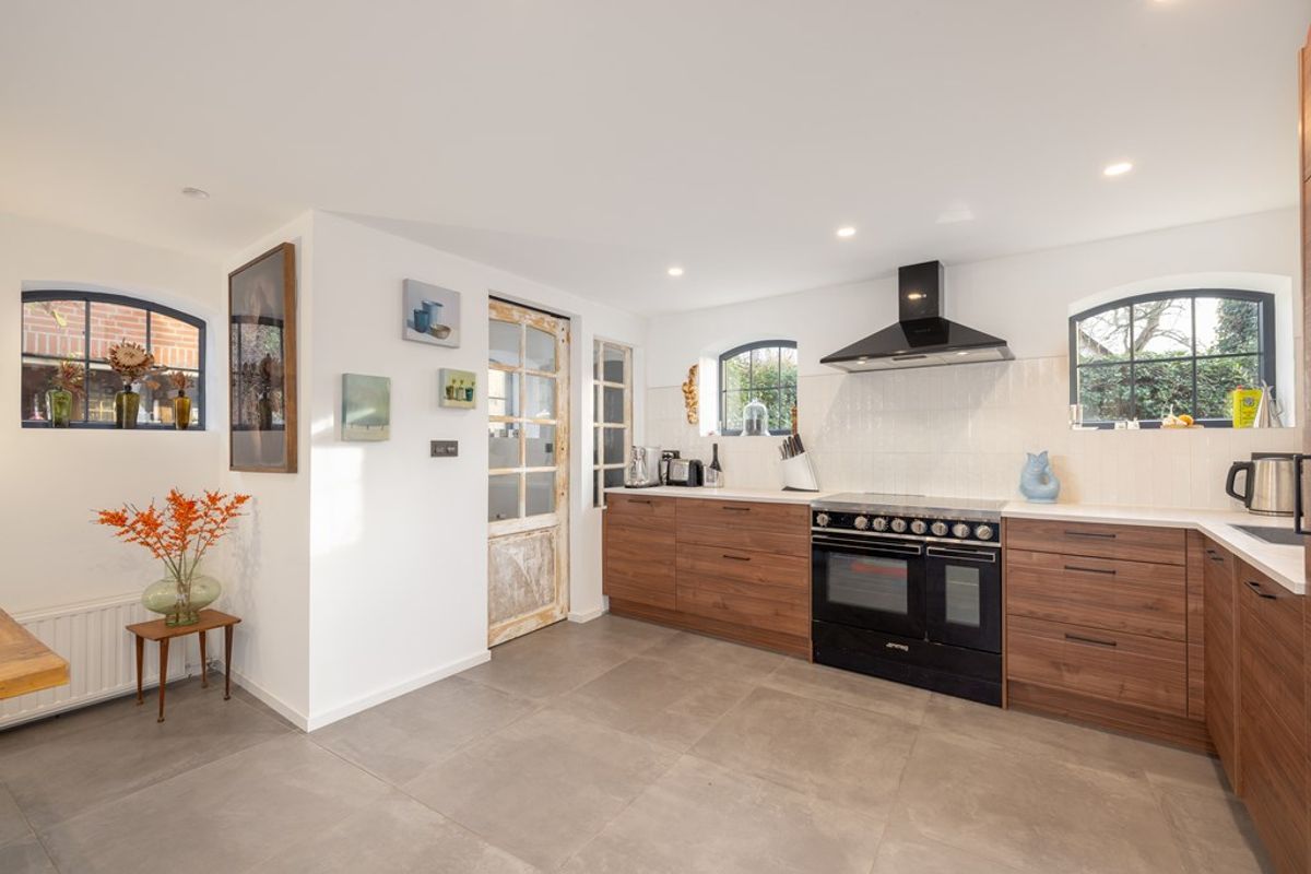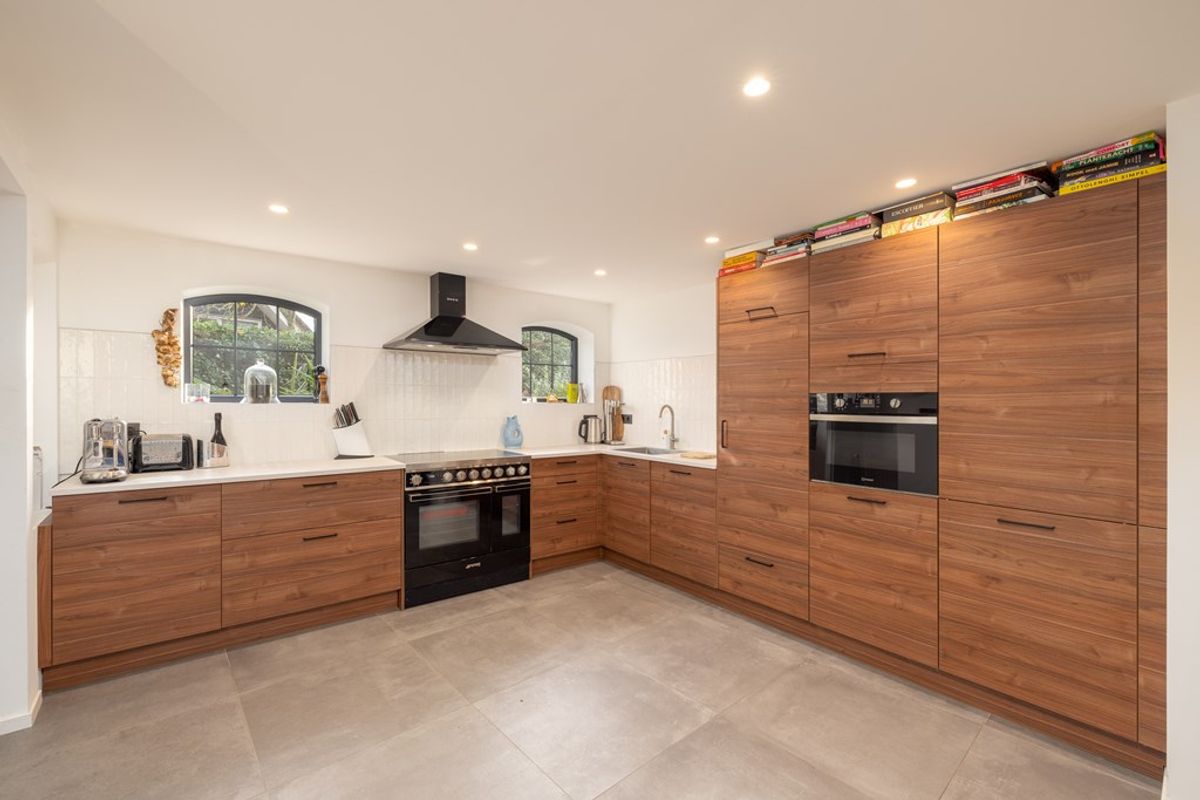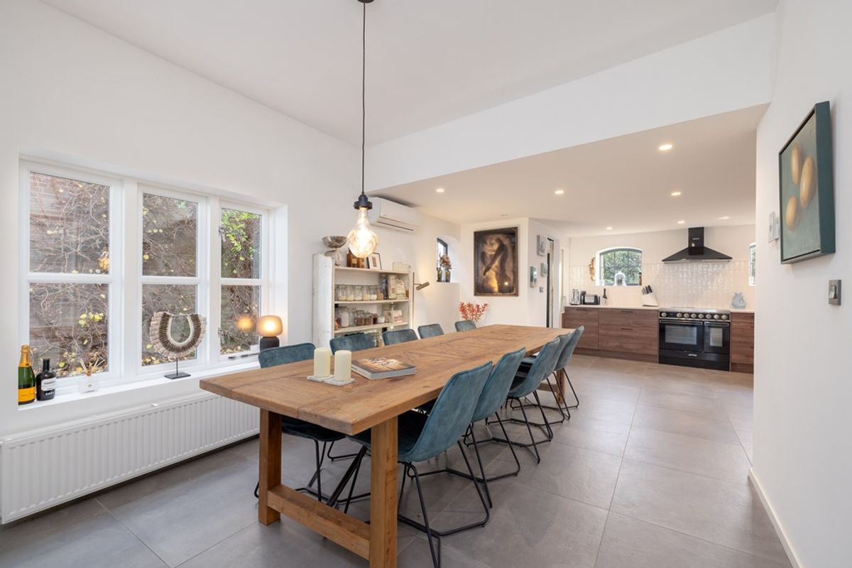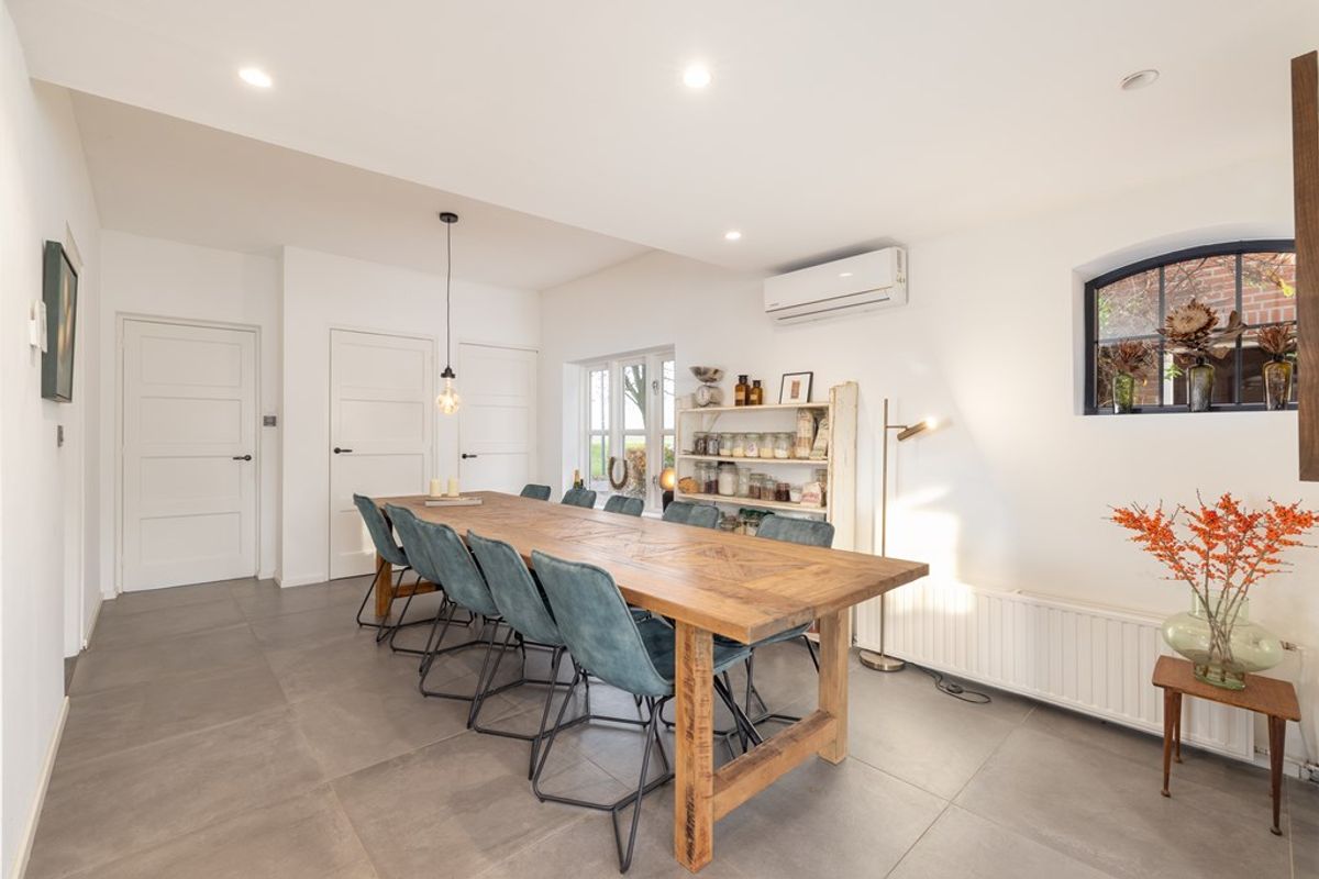De royale woonkeuken met eetkamer vormt het kloppend hart van de woonboerderij. Deze lichte leefruimte is in 2021 volledig vernieuwd en voorzien van een moderne open keuken met kookeiland, maatwerkkasten en hoogwaardige inbouwapparatuur. De warme houttinten en rustige afwerking zorgen voor een tijdloze en stijlvolle uitstraling.