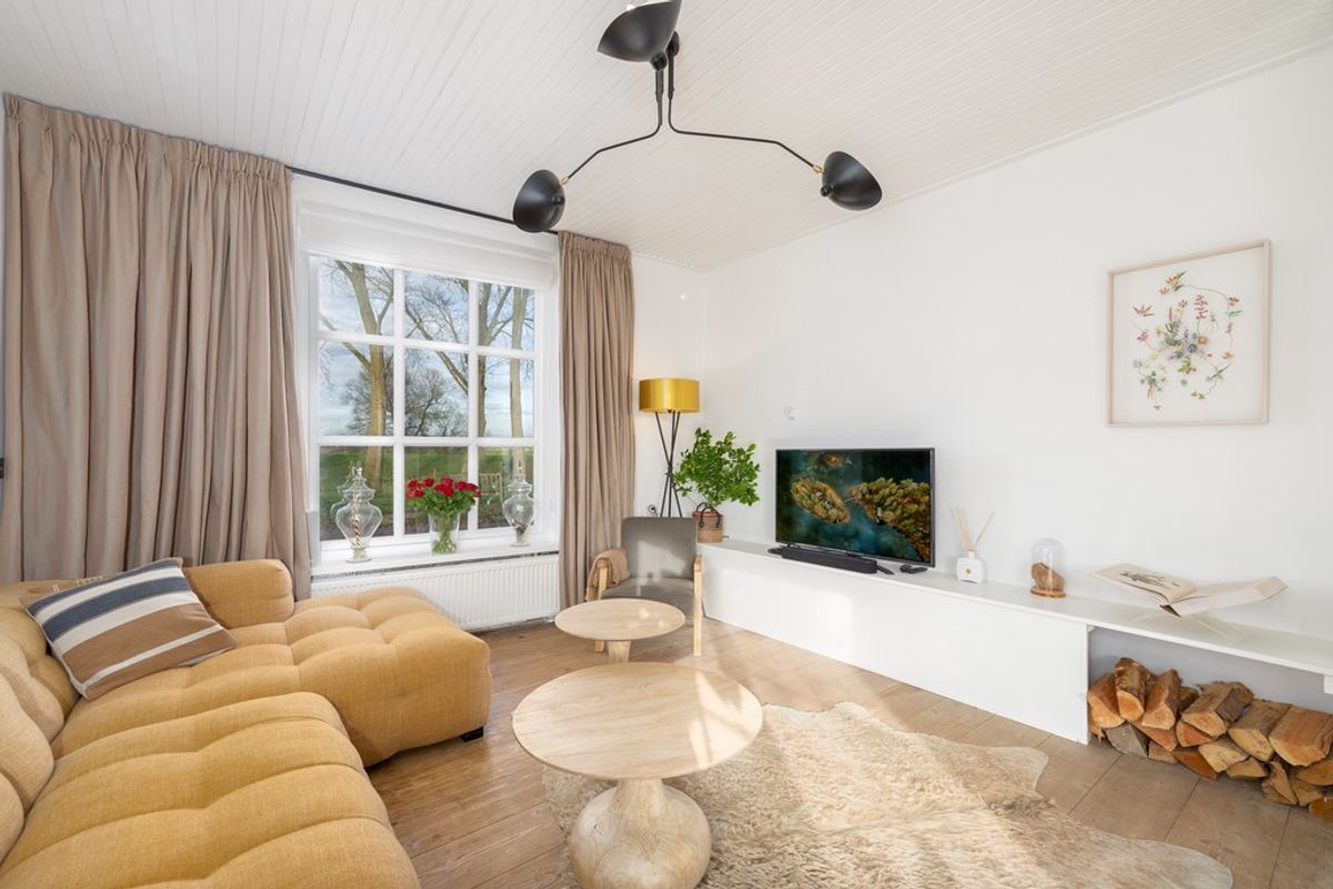 De woonkamer is een lichte en sfeervolle leefruimte met een open en rustige uitstraling. Grote raampartijen zorgen voor een prachtige lichtinval en bieden een vrij uitzicht over het omliggende groen en het Maaslandschap.