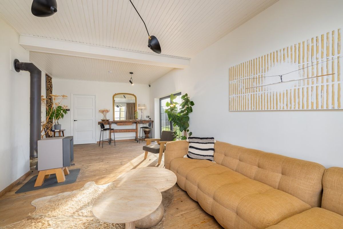 De houten vloer en het witte balkenplafond benadrukken het karakter van de woonboerderij, terwijl de afwerking eigentijds en ingetogen is. De houtkachel vormt het warme middelpunt van de ruimte en zorgt voor extra sfeer tijdens de koudere maanden.