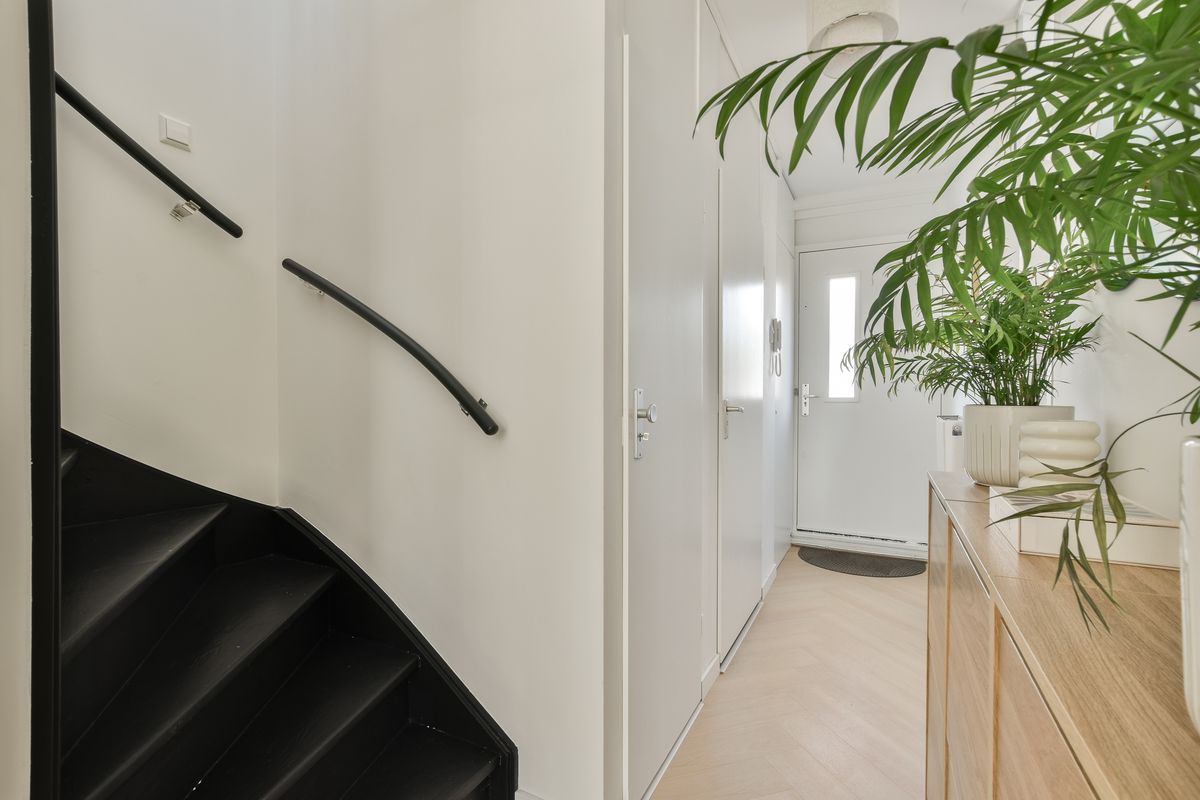 Beveiligde entree appartementencomplex, bellentableau en deur naar trap. De fietsenberging bevindt zich op de begane grond. Daarnaast beschikt u op de begane grond over een eigen berging, perfect om extra spullen te stallen. Parkeren doet u eenvoudig op het ruime parkeerterrein direct voor de deur.