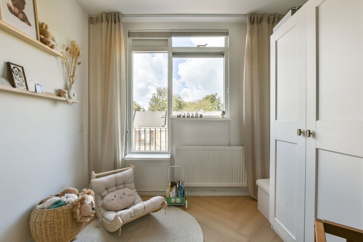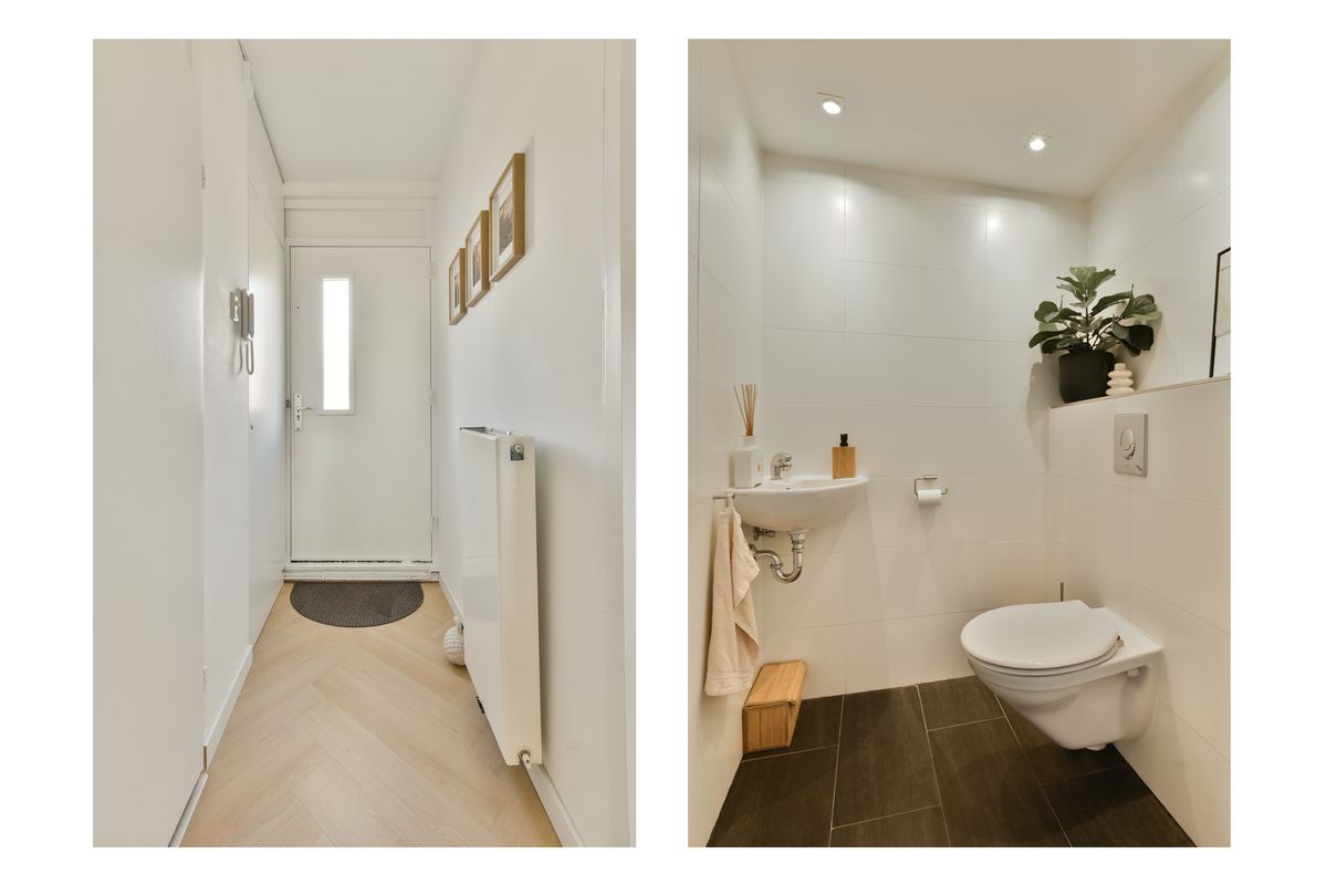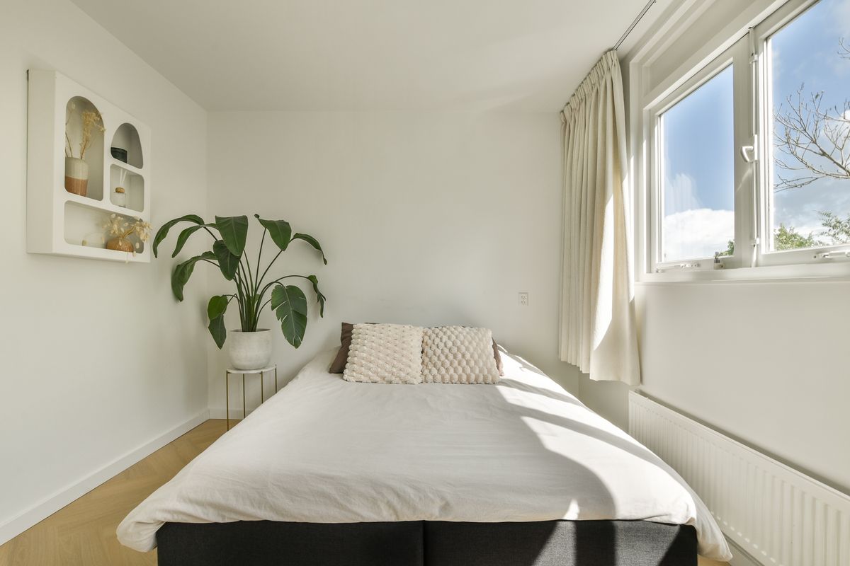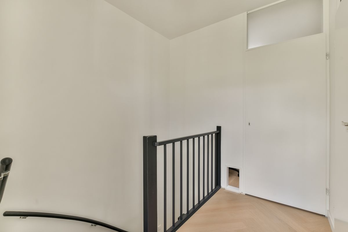 Op de verdieping vindt u een tweede, ruime slaapkamer. Aan de overzijde bevindt zich een praktische berging met dakraam, waar tevens de aansluitingen voor wasmachine en droger zijn geplaatst. Centraal gelegen ligt de badkamer, voorzien van een inloopdouche, wastafel, 2e toilet en een handdoekradiator. De ruimte is modern afgewerkt met antraciet vloertegels en witte wandtegels, wat zorgt voor een frisse en tijdloze uitstraling.