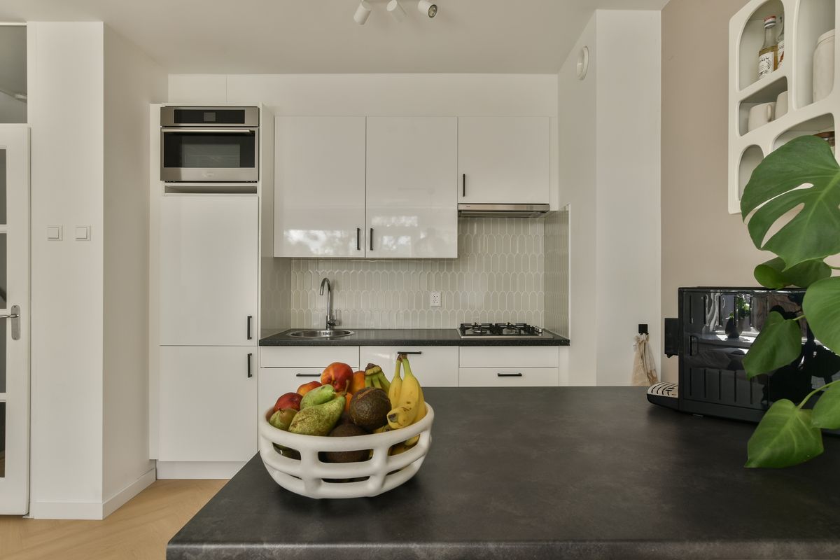 Bij binnenkomst treft u een ontvangsthal met de meterkast, een handige vaste kast met de cv-installatie, een garderobe kast en het toilet met fonteintje en de trap naar de 1e verdieping. Vanuit de hal stapt u de royale en lichte woonkamer met open keuken in. De keuken is strak uitgevoerd in hoogglans wit met een stijlvol antraciet werkblad, geplaatst in rechte opstelling. Uiteraard is deze compleet uitgerust met een, vaatwasser, koel-vriescombinatie, gasfornuis, afzuigkap en oven. Dankzij de grote raampartijen is de woonkamer heerlijk licht en heeft u via een loopdeur directe toegang tot het zonnige balkon. De woonkamer en keuken zijn afgewerkt met een fraaie pvc-vloer, wat zorgt voor een moderne en frisse uitstraling. Verder nog een slaapkamer aan de voorzijde van het appartement.
