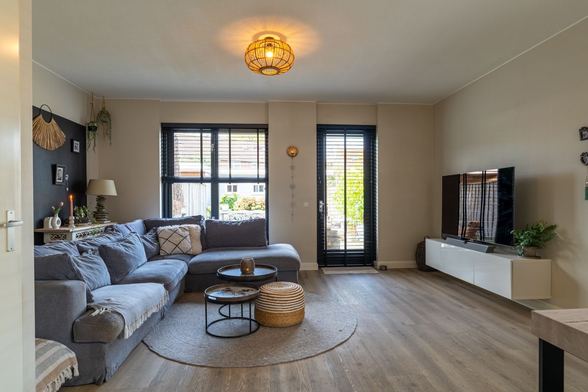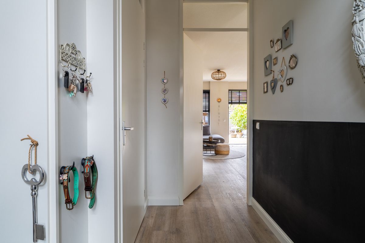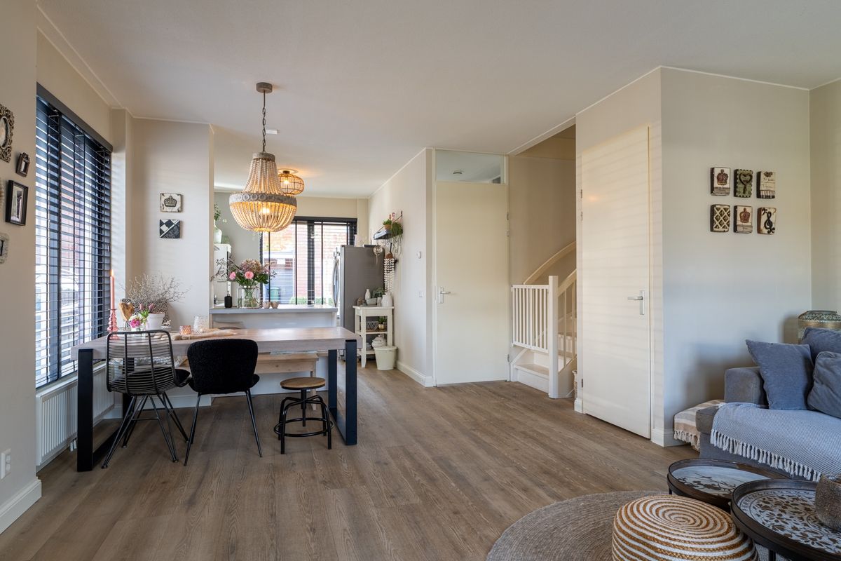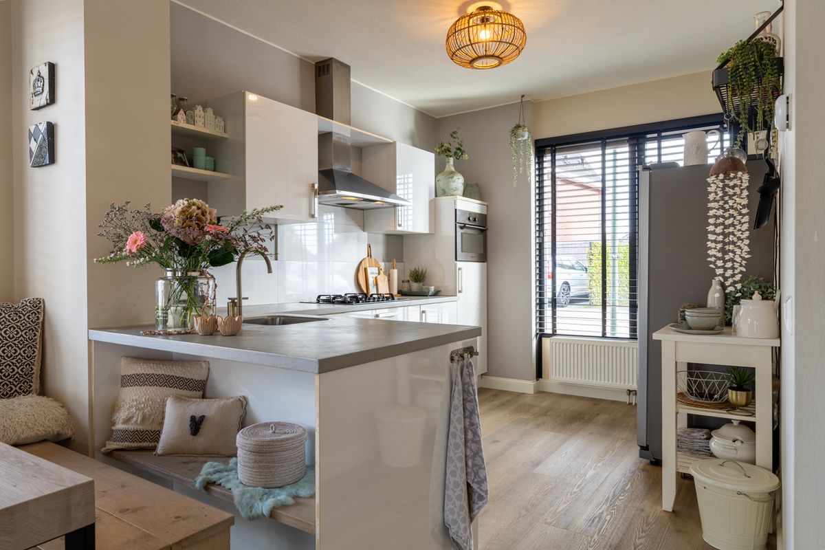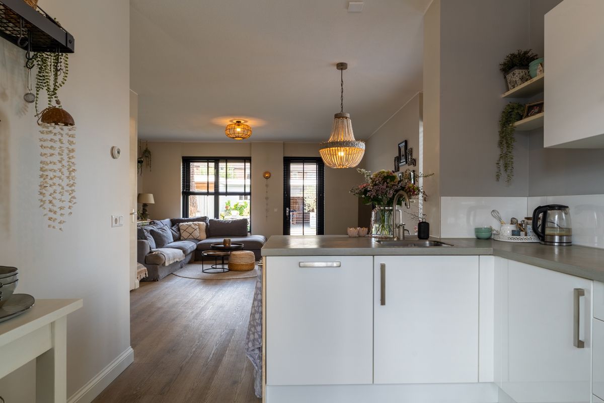 Binnenkomen doe je via de hal met toilet en meterkast. De woonkamer is licht, ruim en sfeervol: de ideale plek om te ontspannen of om gezellig met vrienden en familie te tafelen. Dankzij de grote raampartijen valt er veel daglicht binnen, wat de ruimte nog prettiger maakt. De open keuken is een fijne werkplek voor de kookliefhebber, met een moderne opstelling voorzien van alles wat je nodig hebt: een RVS afzuigkap, 4-pits gaskookplaat, combi-oven/magnetron, vaatwasser en koelkast. Ook handig: in de woonkamer vind je een vaste kast voor extra bergruimte. Via de loopdeur stap je zo de tuin in – ideaal voor die lange zomeravonden!