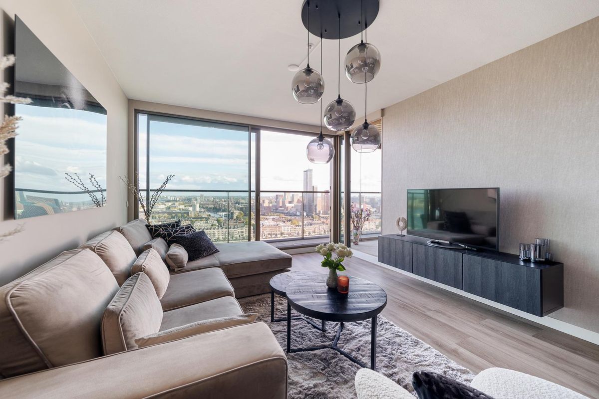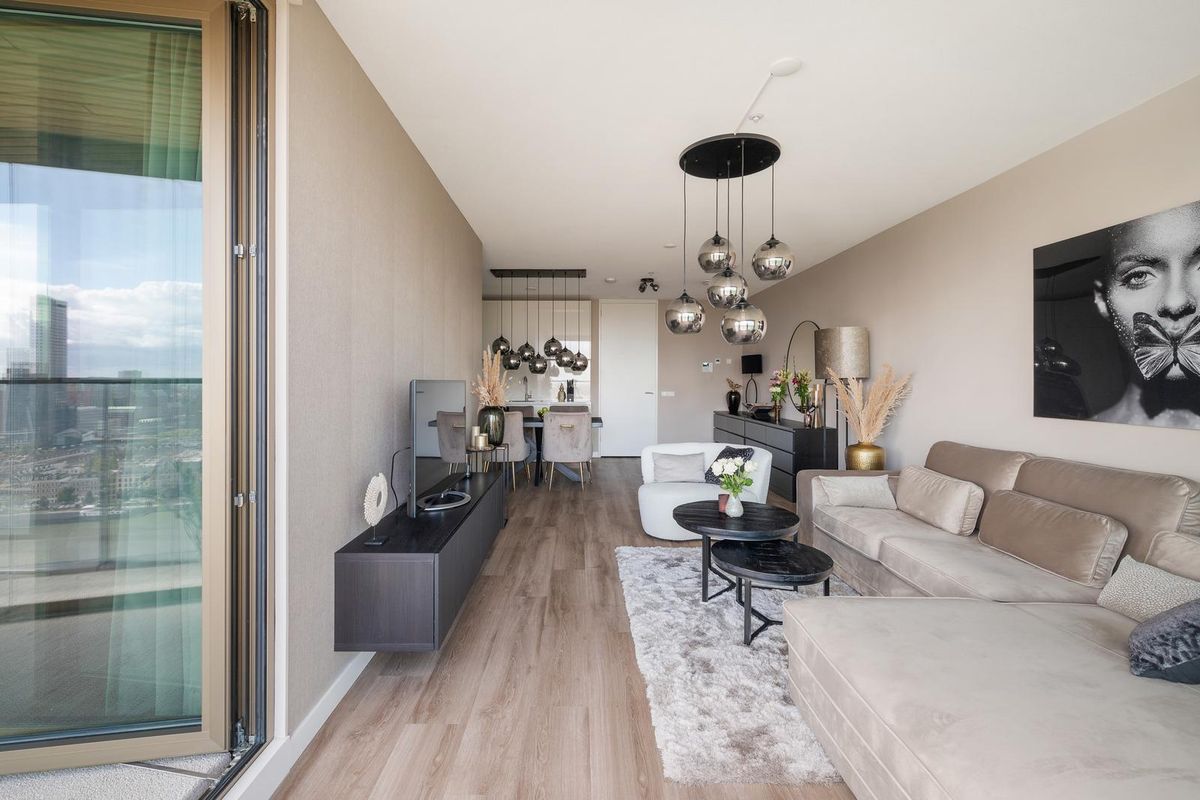 De woonkamer is strak, stijlvol en licht, omlijst door kamerhoge ramen. Terwijl de stad zich onder je ontvouwt, lijkt het alsof de Maas je woonkamer binnenstroomt. De nette vloer en de moderne afwerking geven de ruimte een serene basis, waardoor het uitzicht alle aandacht krijgt en je leeft in style. Hier leef je met de seizoenen, de zonsondergangen en het ritme van de stad.