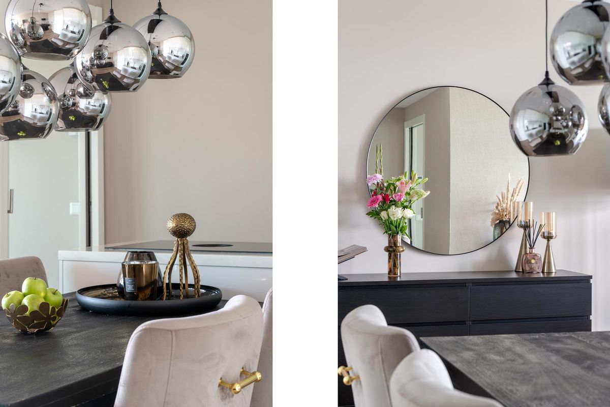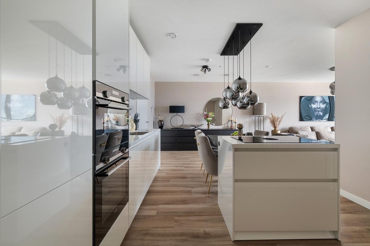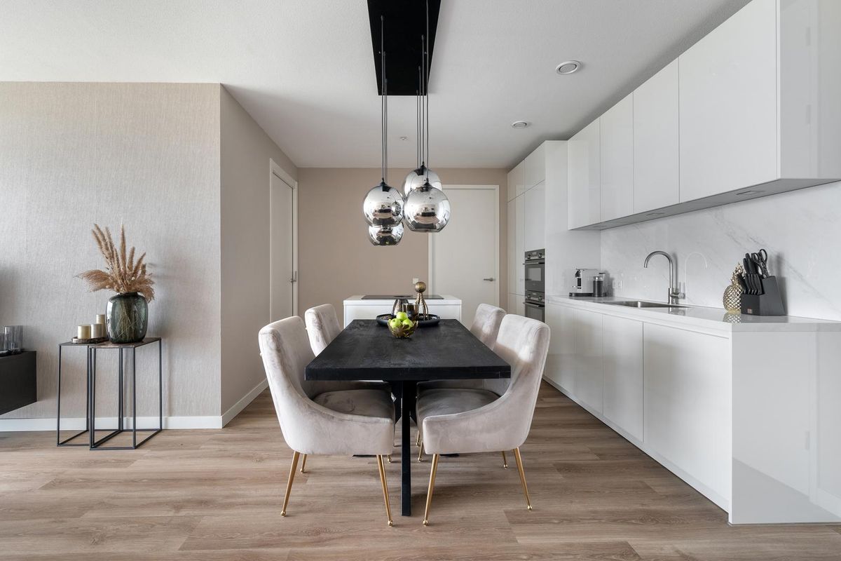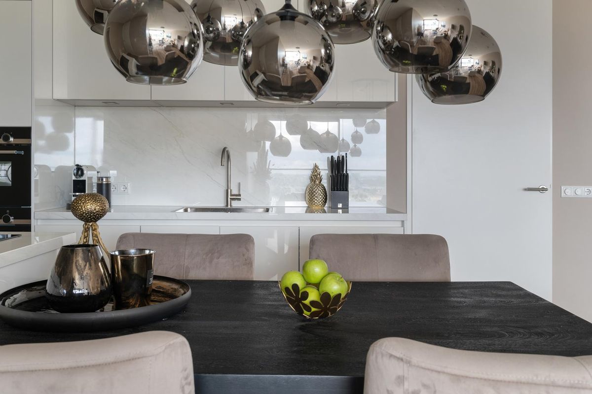 De keuken is modern, minimalistisch en voorzien van hoogwaardige inbouwapparatuur. Het strakke lijnenspel wordt versterkt door een slim geplaatst kookeiland, dat niet alleen extra werkruimte biedt maar ook fungeert als hart van de ruimte. Terwijl je kookt, blijf je verbonden met de woonkamer en het uitzicht. Aan de lange eettafel dineer je met skyline-panorama’s als decor, een setting die elke avond bijzonder maakt.