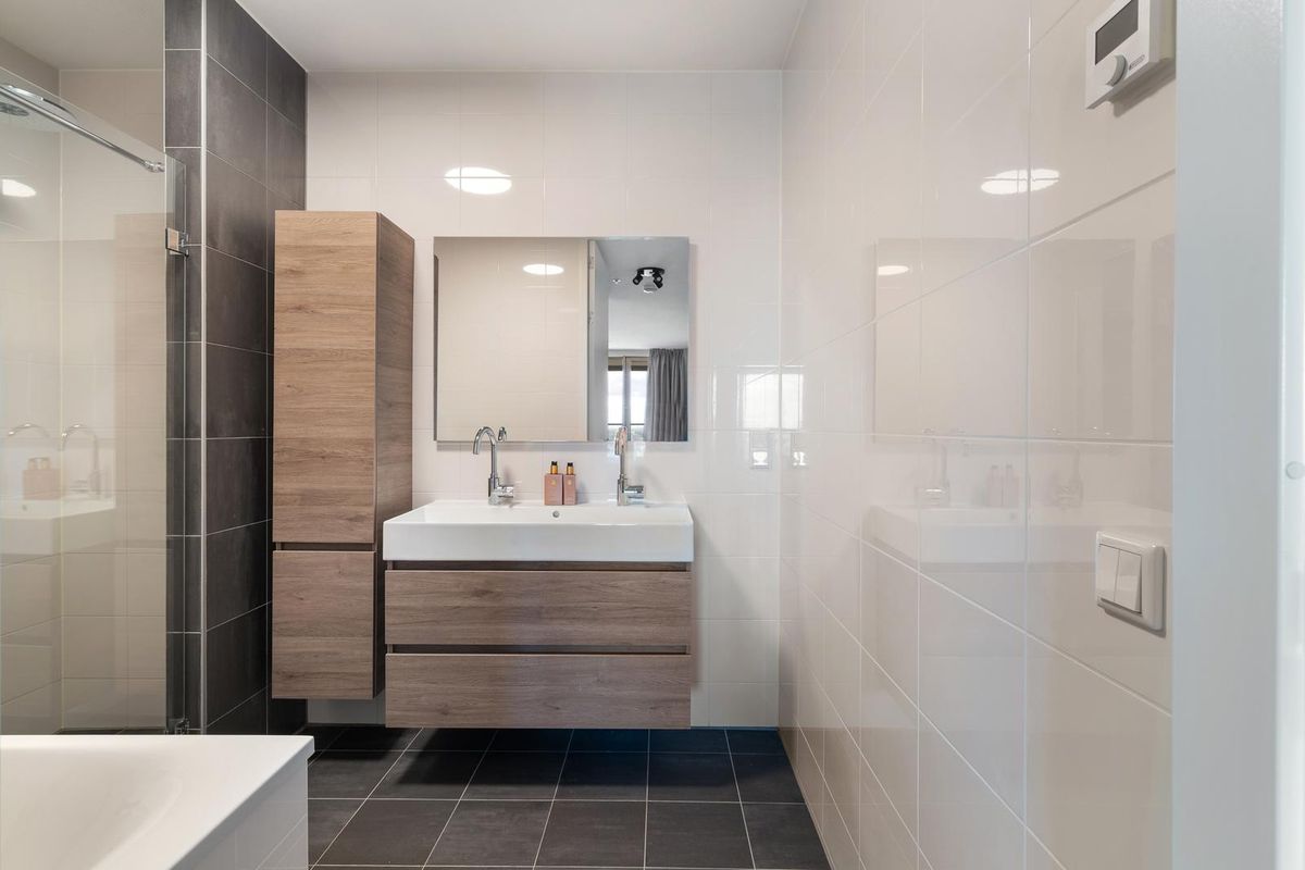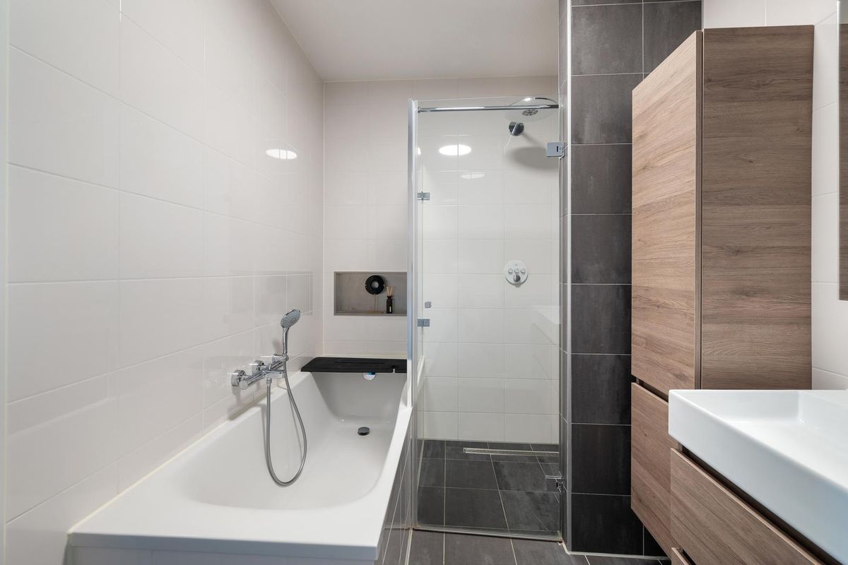 De badkamer is uitgevoerd in een modern design met warme houtaccenten, een inloopdouche en ligbad. Het is de perfecte plek om te ontspannen, met de luxe van een privé-spa.