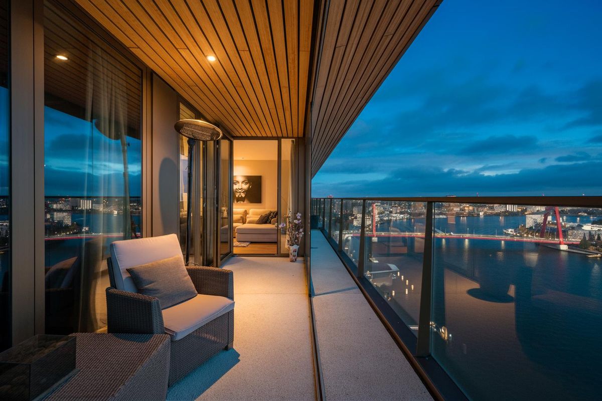 Het royale terras omarmt de woning en biedt het ultieme buitengevoel. Dankzij het slimme schuifsysteem creëer je een beschutte lounge in de winter en een open balkon in de zomer. Je zit hier letterlijk boven de Maas, met Rotterdam aan je voeten.