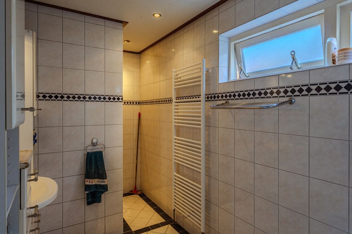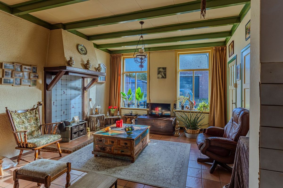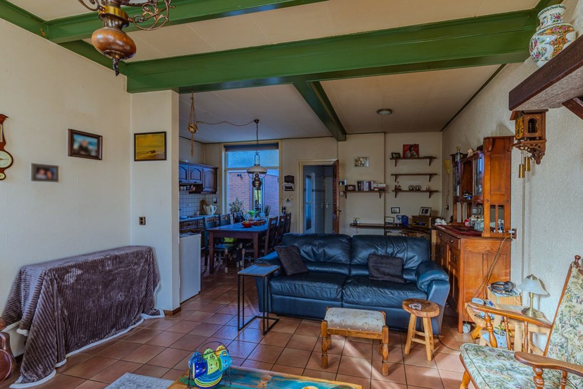 De entree vindt plaats in de hal voorzien van de trapopgang en de garderoberuimte. Aan de straatzijde van de woonkamer vind je de nog originele schouw met het evenzo originele tegelwerk waar omheen het zitgedeelte gesitueerd. Dankzij het hoge balkenplafond en de royale raampartijen geniet deze ruimte van veel natuurlijk licht. De open keuken is uitgerust met een dubbele rvs-spoelbak, een gasfornuis, diverse bovenkasten en een oven/magnetron. Vanuit de keuken toegang tot de ruime kelder-/proviandkast. In de aanbouw bevindt zich het achterportaal met toegang tot de tuin, de nette toiletruimte v.v. een staand toilet en een fonteintje en de badkamer. Deze ruime en geheel betegelde badkamer is voorzien van de witgoedaansluitingen, een inloopdouche, een wastafel met groot meubel en een vaste kast met de CV-installatie.