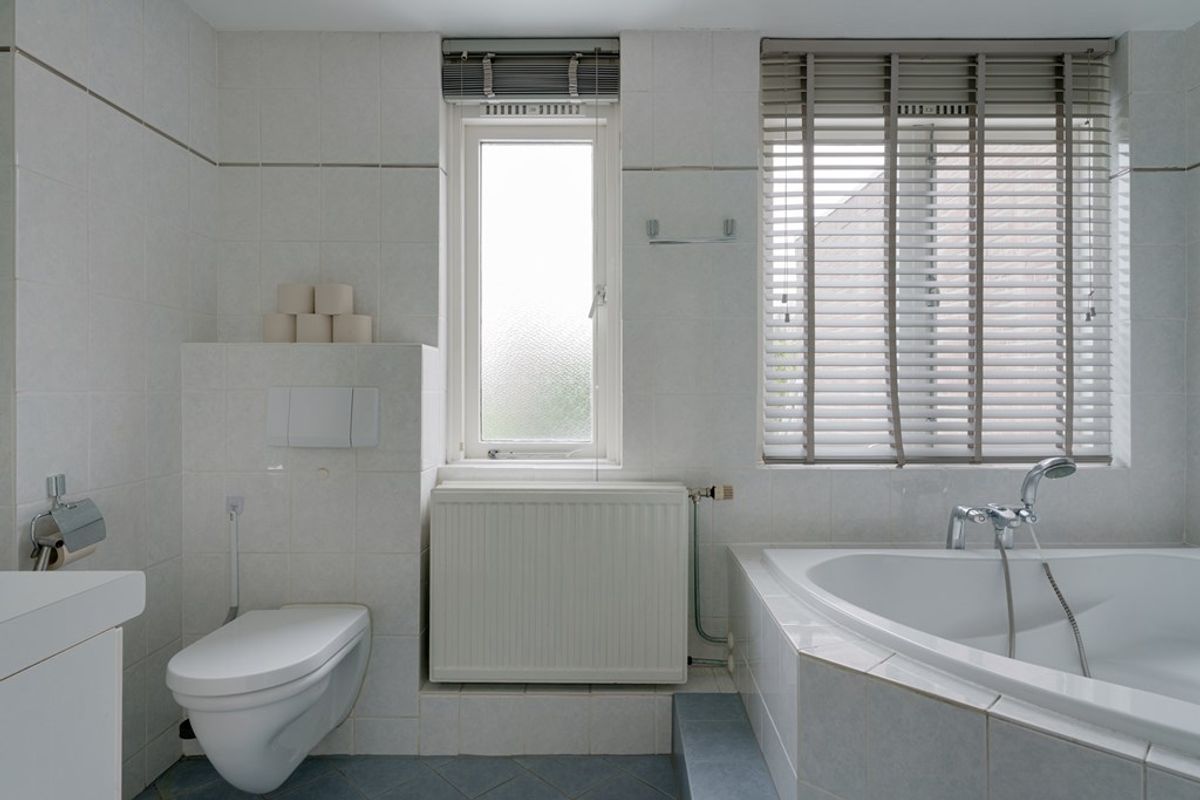 De badkamer is volledig betegeld en compleet uitgevoerd met een wastafelmeubel, een tweede toilet, een comfortabel hoekbad en een moderne inloopdouche. Tevens bevinden zich hier de aansluitingen voor wasmachine en droger.