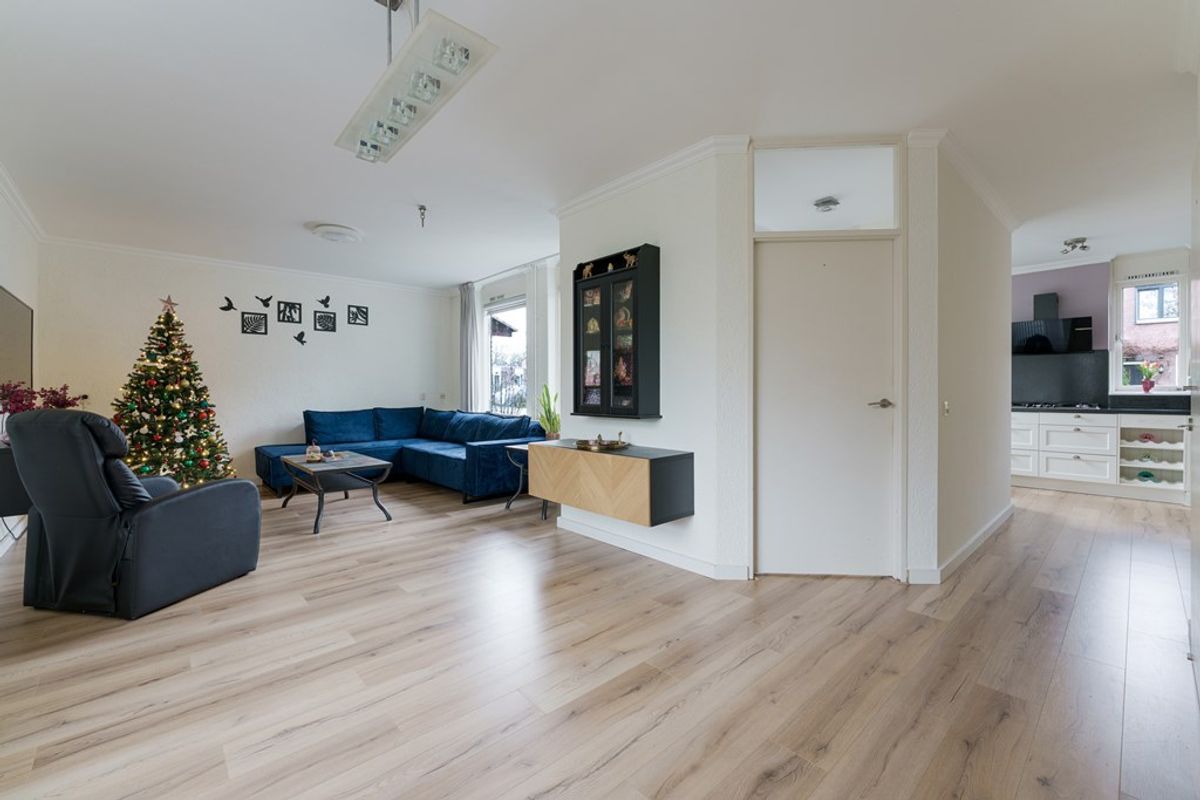 De speelse en lichte woonkamer vormt samen met de serre een royale leefruimte waar wonen en ontspannen centraal staan. De grote raampartijen zorgen voor een prettige lichtinval en een open sfeer. De gehele begane grond is afgewerkt met een onderhoudsvriendelijke laminaatvloer.