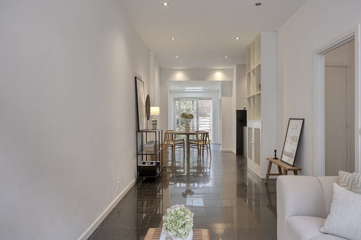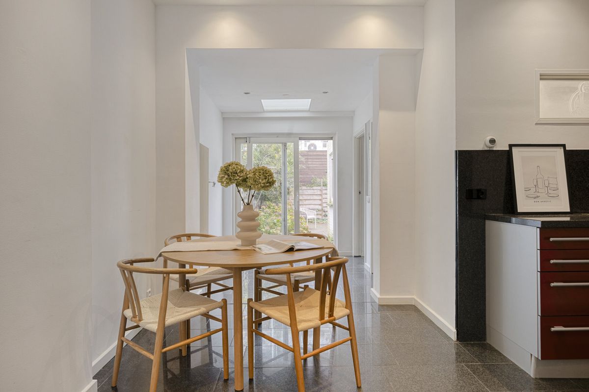 De royale living met open keuken voelt direct ruim en licht door de plafondhoogte van ca. 2,85 meter. Vanuit de woonkamer stap je zo de fraai aangelegde achtertuin in, een verlengstuk van je leefruimte, vooral op zonnige dagen.