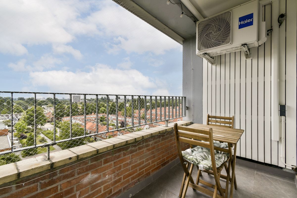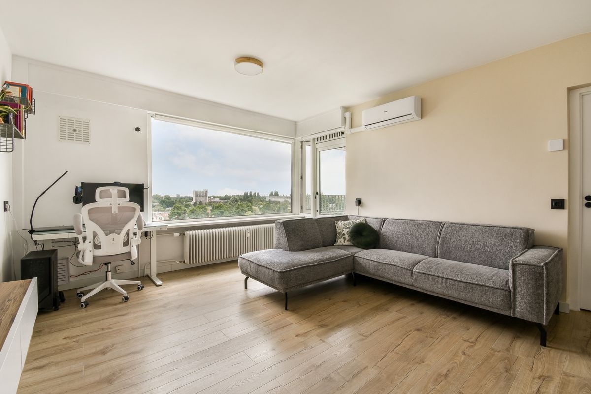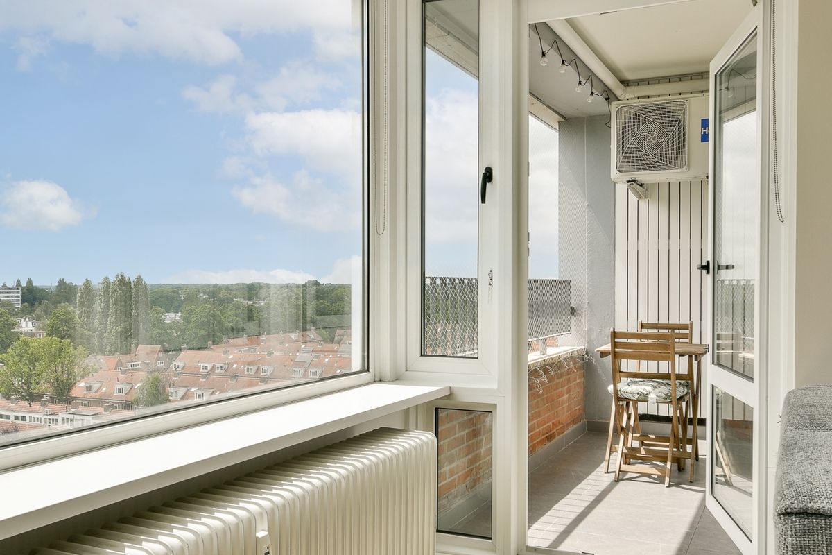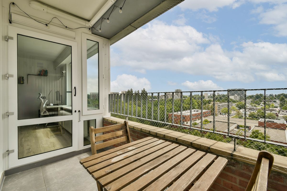 Lovely bright one-bedroom apartment with spacious balcony, located on the 9th (also top) floor of a well-maintained apartment complex with secured entrance, two elevators and storage rooms in the basement. The apartment offers a magnificent view in various directions over Amsterdam and Amstelveen and is very centrally located on the border of Amsterdam and Amstelveen Randwijck.
