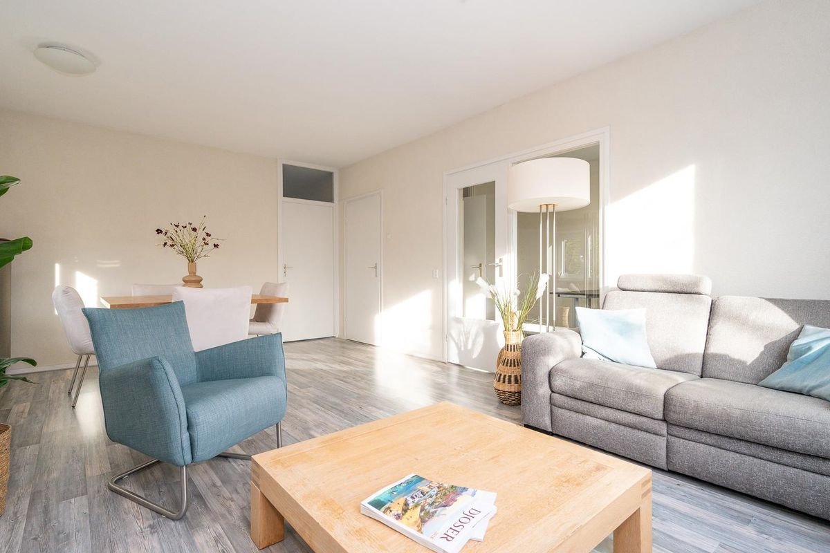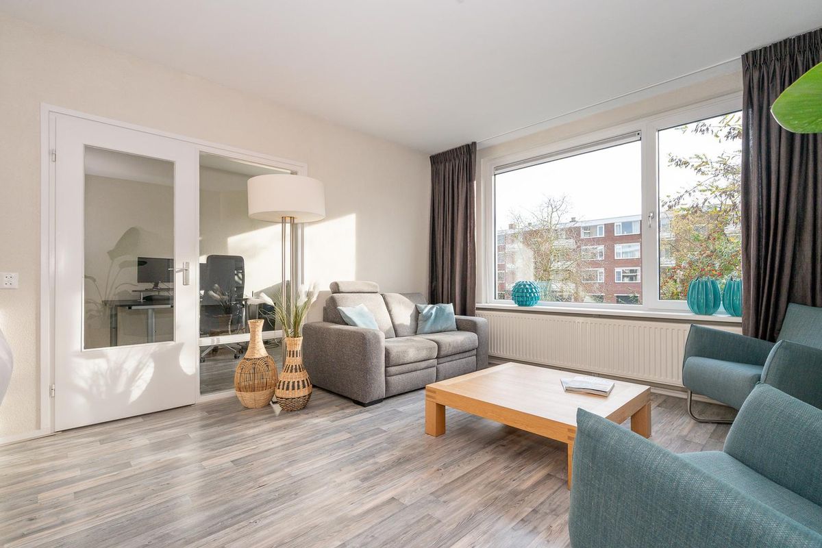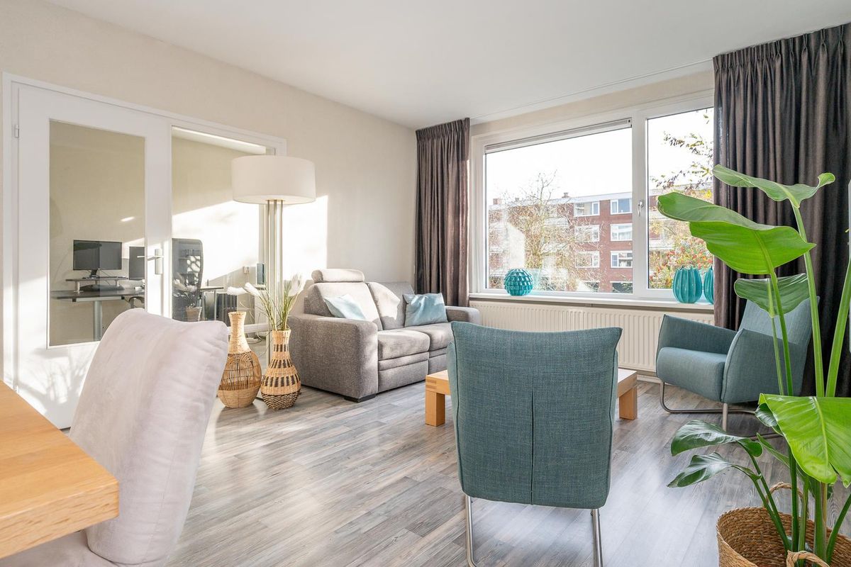 Op de eerste verdieping van dit kleinschalige appartementencomplex bevindt zich dit ruime en lichte appartement. Bij binnenkomst kom je terecht in een ruime hal, vanuit hier heb je toegang tot vrijwel alle ruimtes in het appartement. Direct aan de rechterzijde is de keuken, voorzien van inductiekookplaat, oven, afwasmachine, de wasmachineaansluiting en toegang tot één van de twee balkons. De grootste van de drie (slaap)kamers aan de voorzijde biedt genoeg ruimte voor het plaatsen van een ruim tweepersoonsbed en een kastenwand en is verbonden met de nette badkamer welke is voorzien van een douche en wastafel. Er is een apart toilet zodat de gasten niet in de badkamer hoeven te komen.