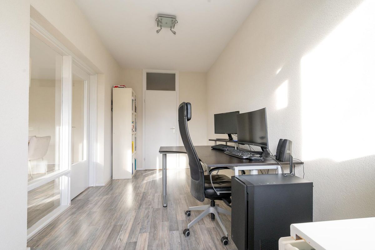 Vanuit de woonkamer kijk je uit over het groen en door de ligging, op de hoek van het complex, is deze fijne kamer voorzien van een extra raam, waardoor er veel natuurlijk daglicht binnentreed. Aangrenzend aan de woonkamer is nog een kamer, deze wordt nu gebruikt als werkkamer en geeft toegang tot het grote balkon met uitzicht op de gezamenlijke tuin. Deze kamer kan ook bij de woonkamer worden betrokken en worden ingericht als eetkamer, zodat de leefruimte nog ruimer wordt of juist worden afgeschermd waardoor er een derde slaapkamer wordt gecreëerd. Naast de werkkamer is er nog een (slaap)kamer die is gelegen aan de tuinzijde van het appartement en deze biedt eveneens toegang tot het balkon.