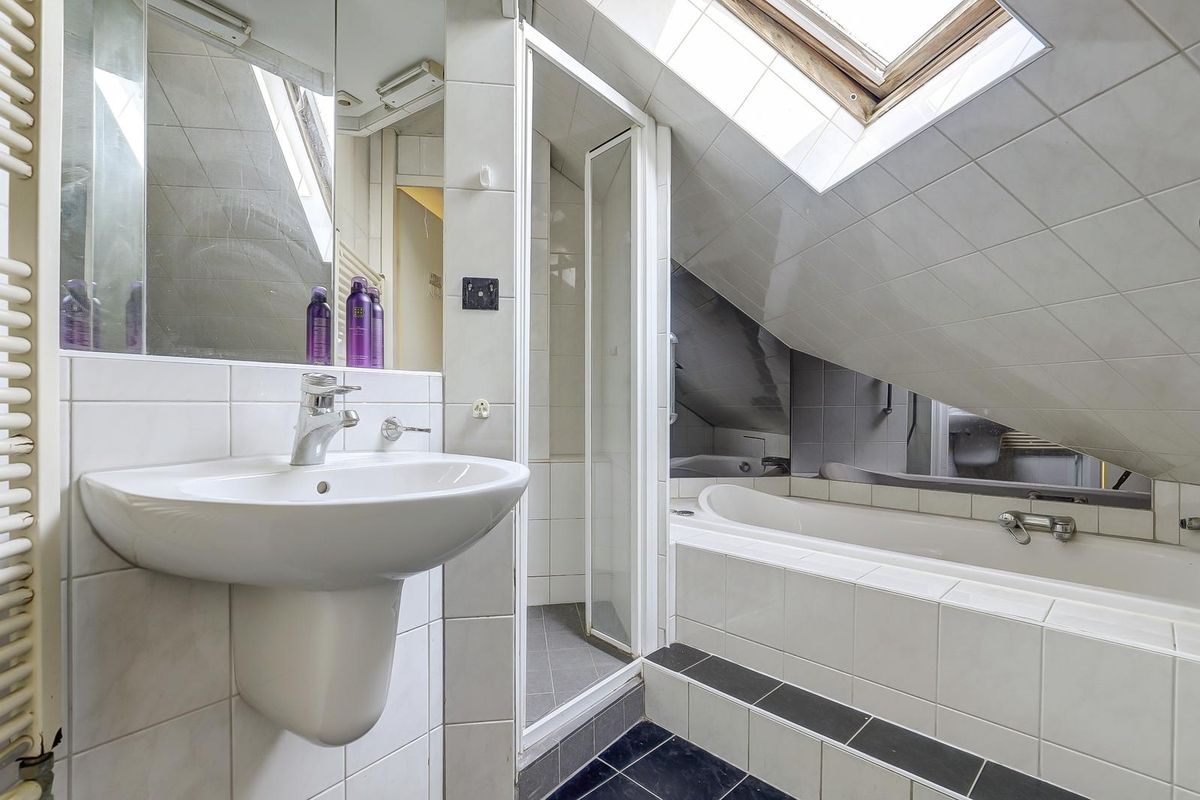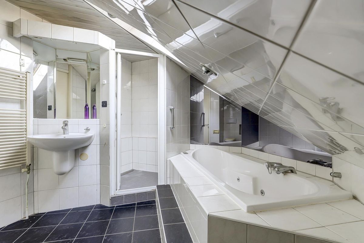 Volledig betegeld in zwart-witte kleurstelling en uitgerust met een whirlpool ligbad, aparte douchecabine, wastafelmeubel, designradiator, tweede hangtoilet en een Velux dakraam.