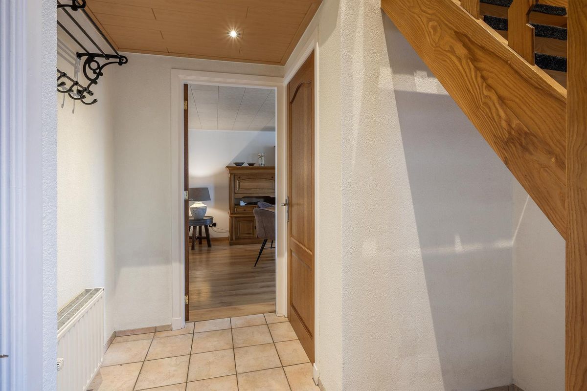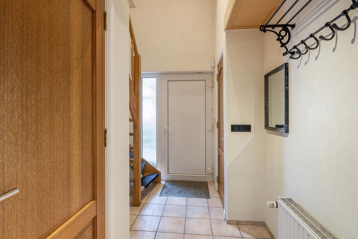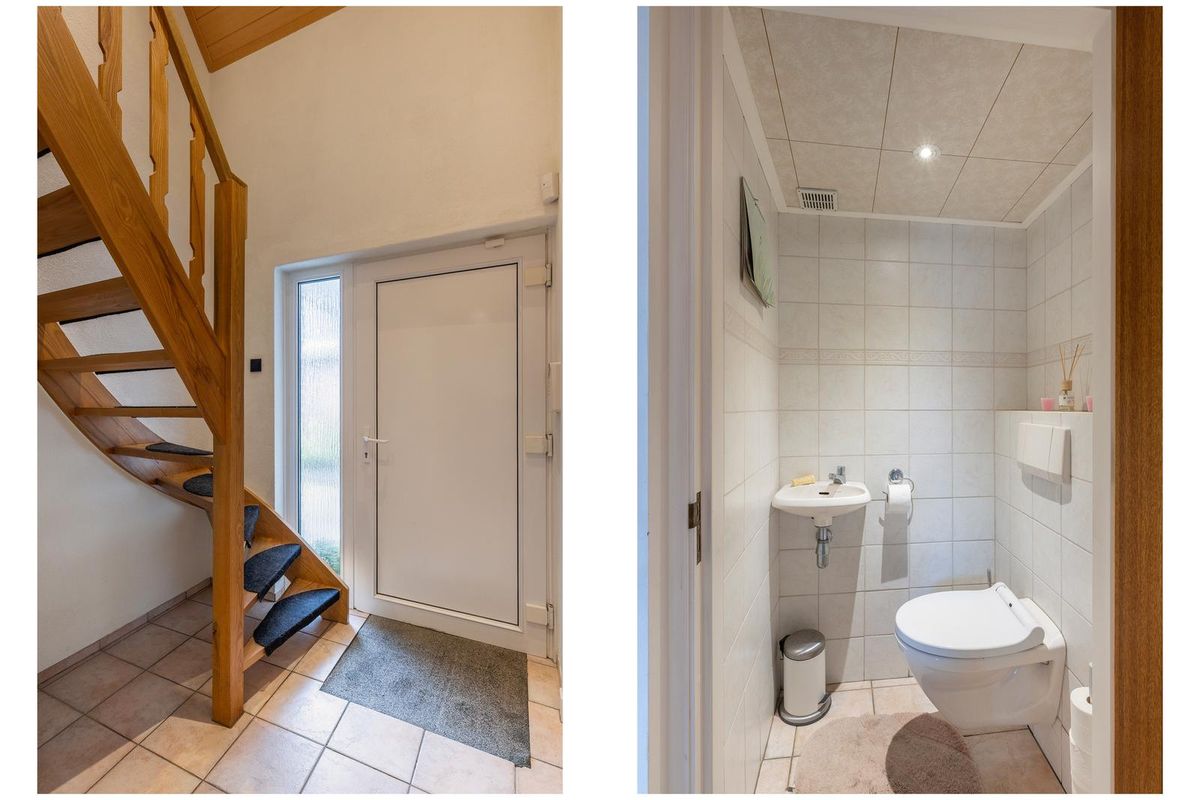 Hal/entree met de meterkast (11 groepen, 1 aardlekschakelaar, 3 fasen en slimme meters), betegeld toilet met fontein, trapopgang en toegang tot de woonkamer.