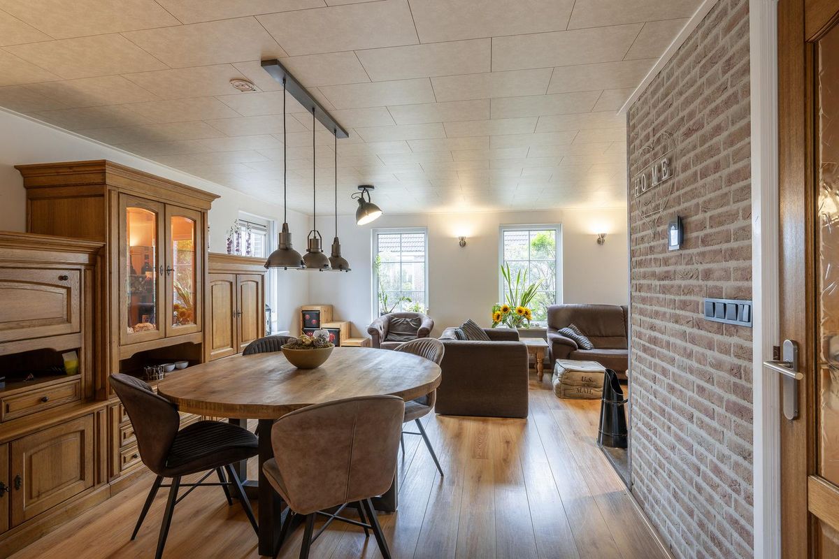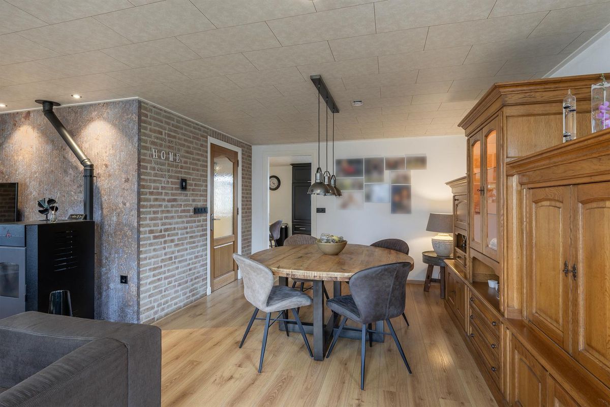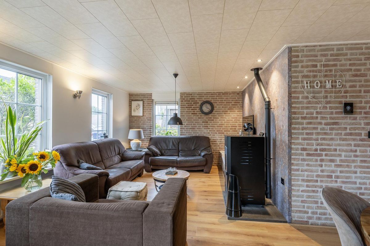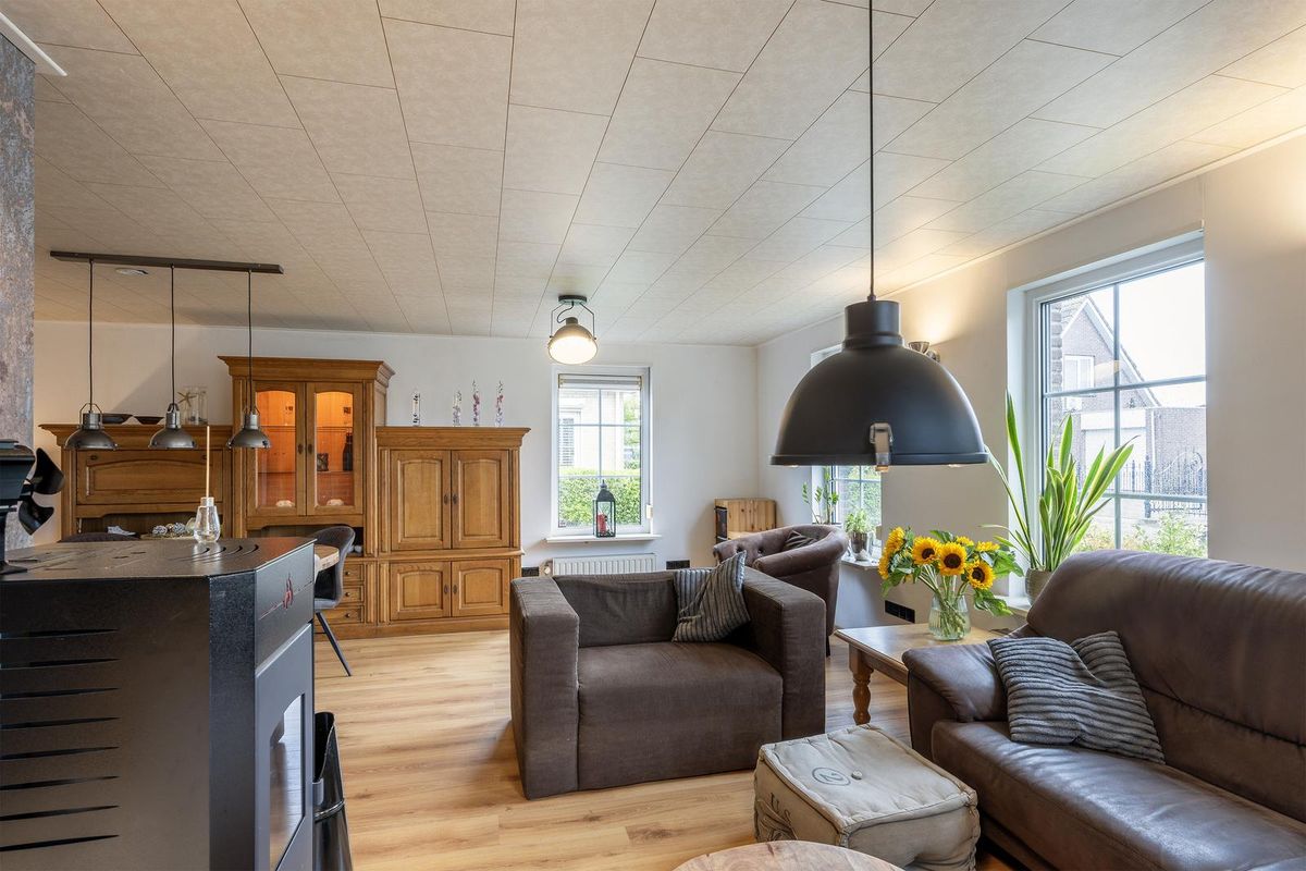 L-vormige woonkamer met rolluiken, een sfeervolle pelletkachel, schoonmetselwerkwanden en een deur naar de keuken.