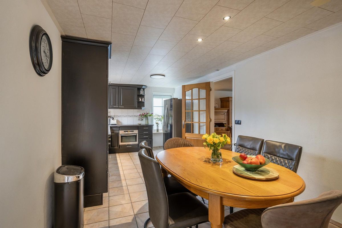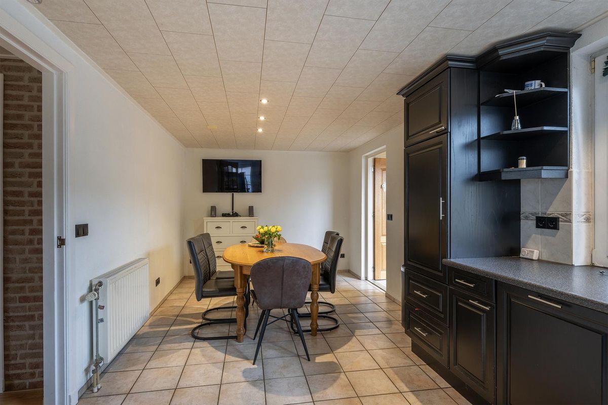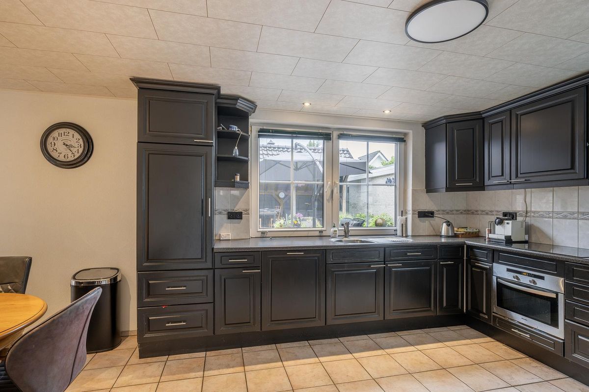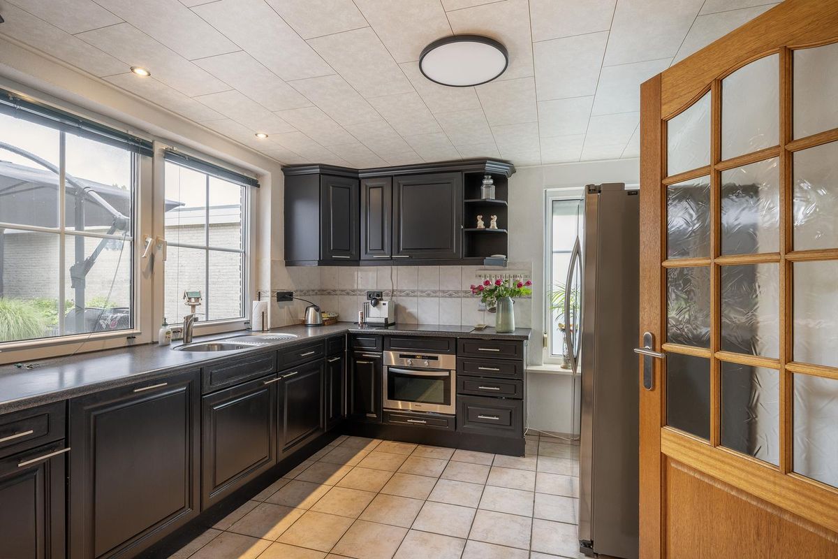 De riante woonkeuken heeft een keukenblok in hoekopstelling welke voorzien is van een 5-groeps keramische kookplaat, afzuigkap, combi-ovenmagnetron, Amerikaanse Koel-vriescombinatie, vaatwasser, spoelbak en bovenkasten.