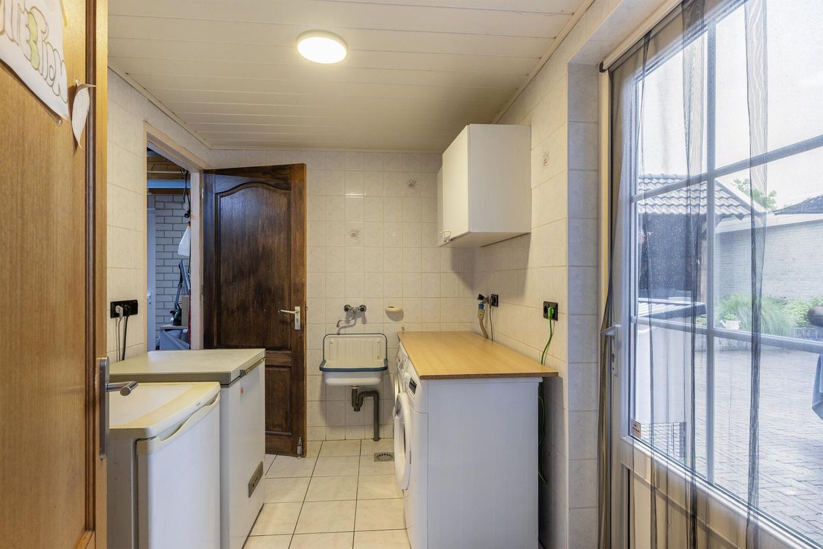 Geheel betegelde bijkeuken met de opstelplaats voor de CV-combiketel (Nefit, 2017), witgoedaansluitingen, spoelbak (met warm en koud water) en toegang tot de garage en de achtertuin.