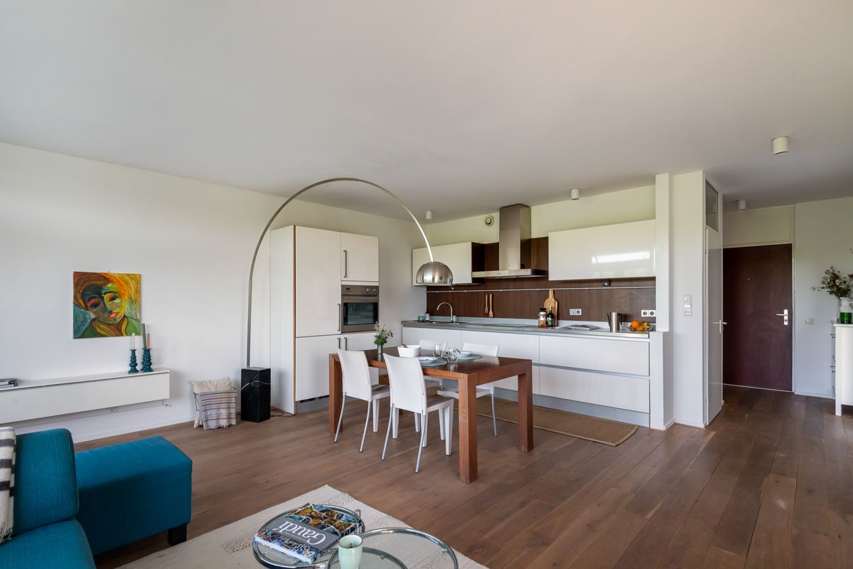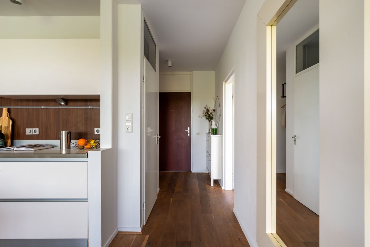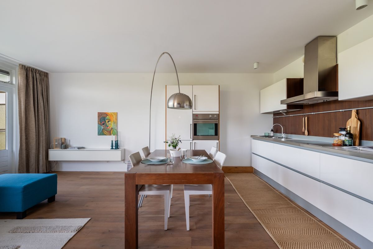 From the living room, you access the second balcony, which offers a stunning view of the Haagse Bos. In the hallway, there is a built-in storage closet with connections for a washing machine and dryer. The entire apartment features a solid oak floor, adding warmth and character throughout.