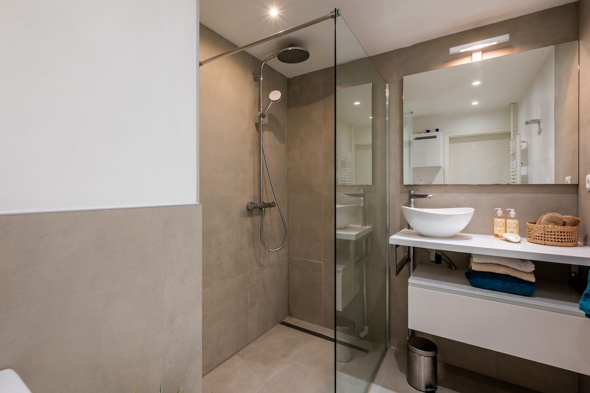 The bathroom is neatly finished with light tiles and features a walk-in shower, vanity unit, toilet, and radiator—modern and timeless in design.