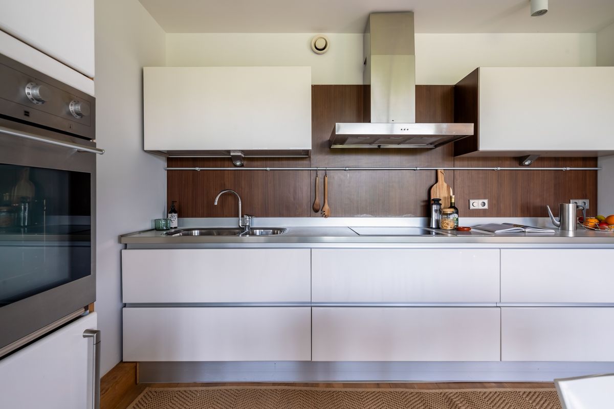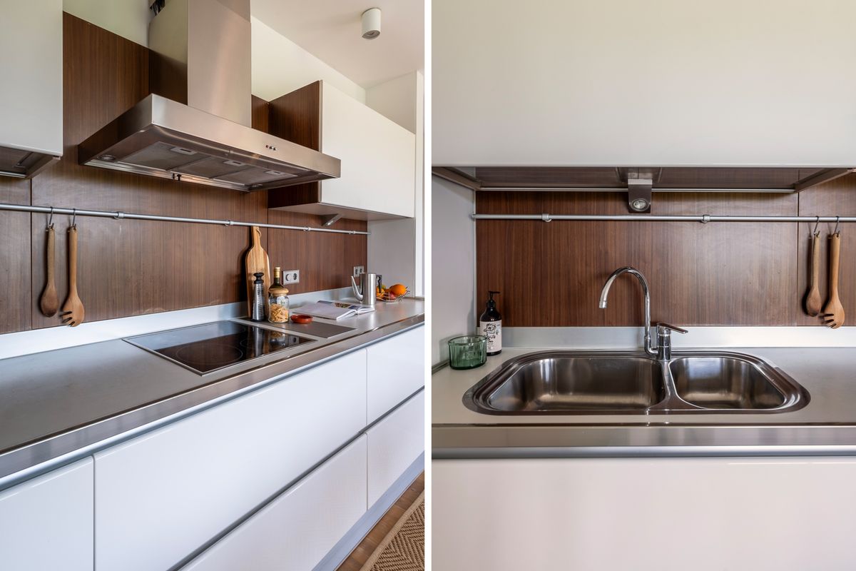 The living room is wonderfully bright and, together with the open kitchen, forms a cozy living space. Positioned at treetop height, it offers a calming view of the greenery. The kitchen is modern and fully equipped with a ceramic cooktop, oven, dishwasher, refrigerator, and freezer, efficiently laid out and ready to use.