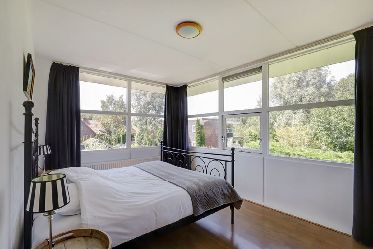 Op de 1e etage zijn 2 grote slaapkamers en een badkamer. In de badkamer is een ligbad met douche, een toilet en een wastafel. Vanuit de slaapkamers heb je een mooi uitzicht over de tuin, het water en het bos dat daarachter ligt.