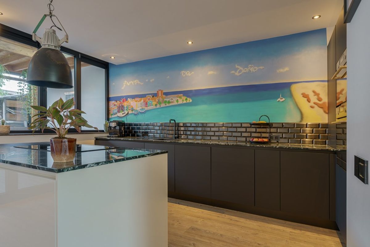 De ruime woonkamer is een echte eyecatcher van de woning, mede dankzij de vloerverwarming op de begane grond, die voor een behaaglijk klimaat zorgt. Vanuit de woonkamer heb je direct toegang tot de moderne open keuken, die is voorzien van een stijlvol granieten aanrechtblad en alle denkbare inbouwapparatuur: inductiekookplaat, vaatwasser, vriezer, koelkast, twee ovens, magnetron en een handige spoelbak. Het geheel is strak afgewerkt en functioneel ingedeeld, zodat koken en leven moeiteloos samenkomen.