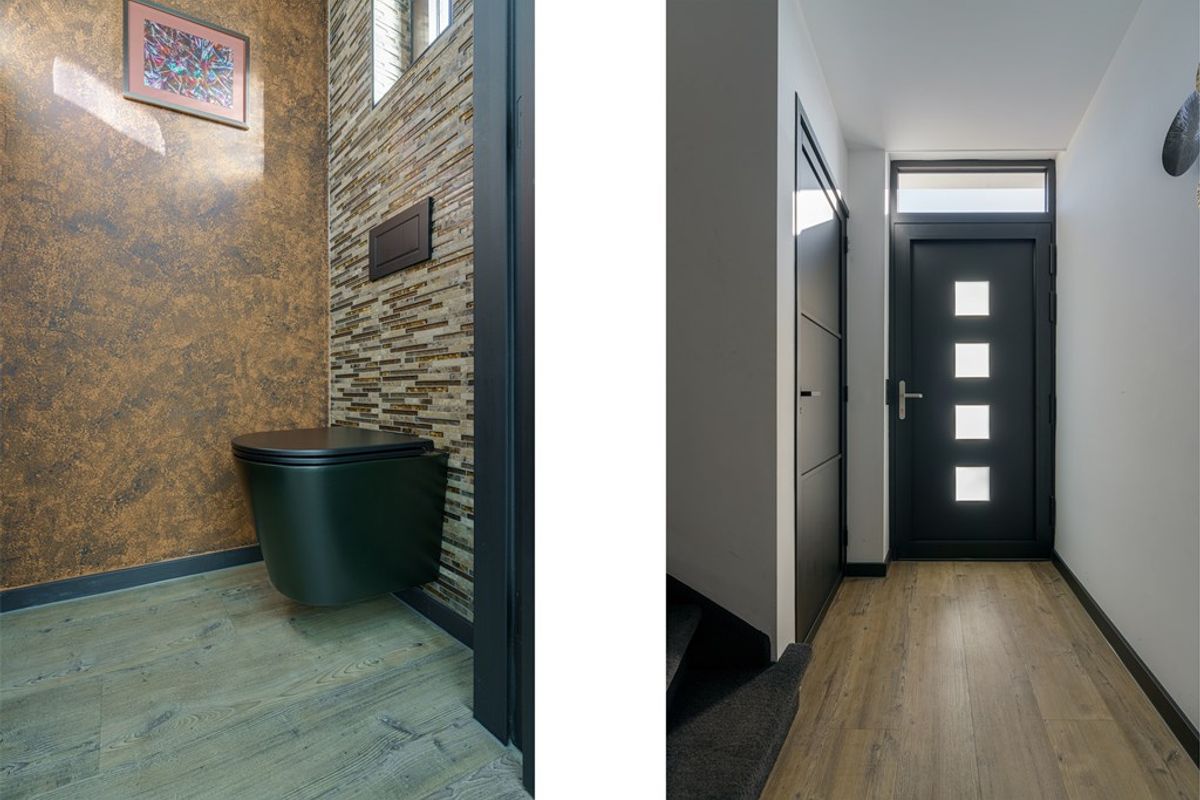 Bij binnenkomst word je verwelkomd in een lichte en verzorgde hal die direct een gevoel van ruimte en comfort geeft. De meterkast is voorzien van nieuwe elektra, waardoor alles veilig en up-to-date is. Naast de hal bevindt zich een aparte toiletruimte met modern inbouwtoilet, fraai afgewerkt en stijlvol vormgegeven – ideaal voor gasten en dagelijks gebruik.