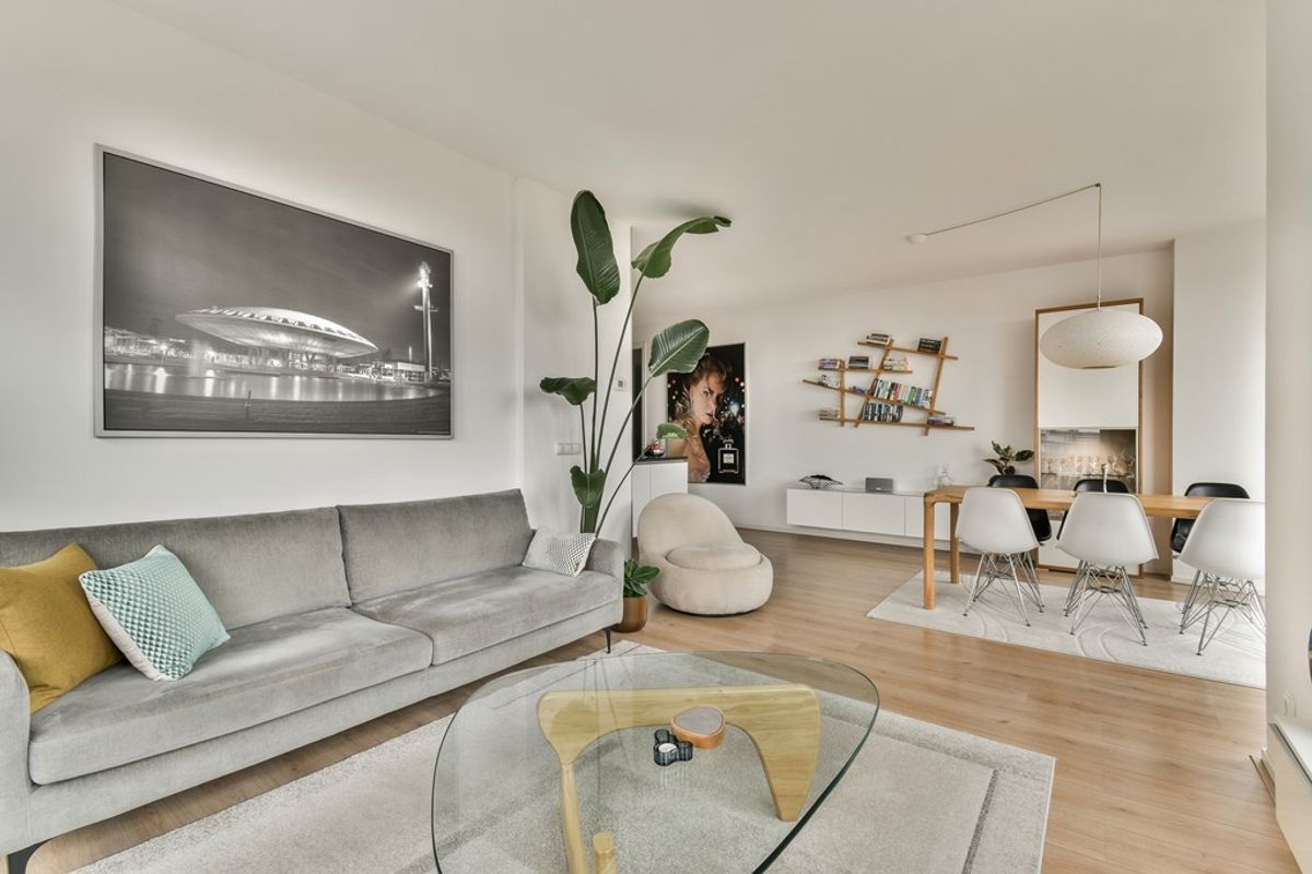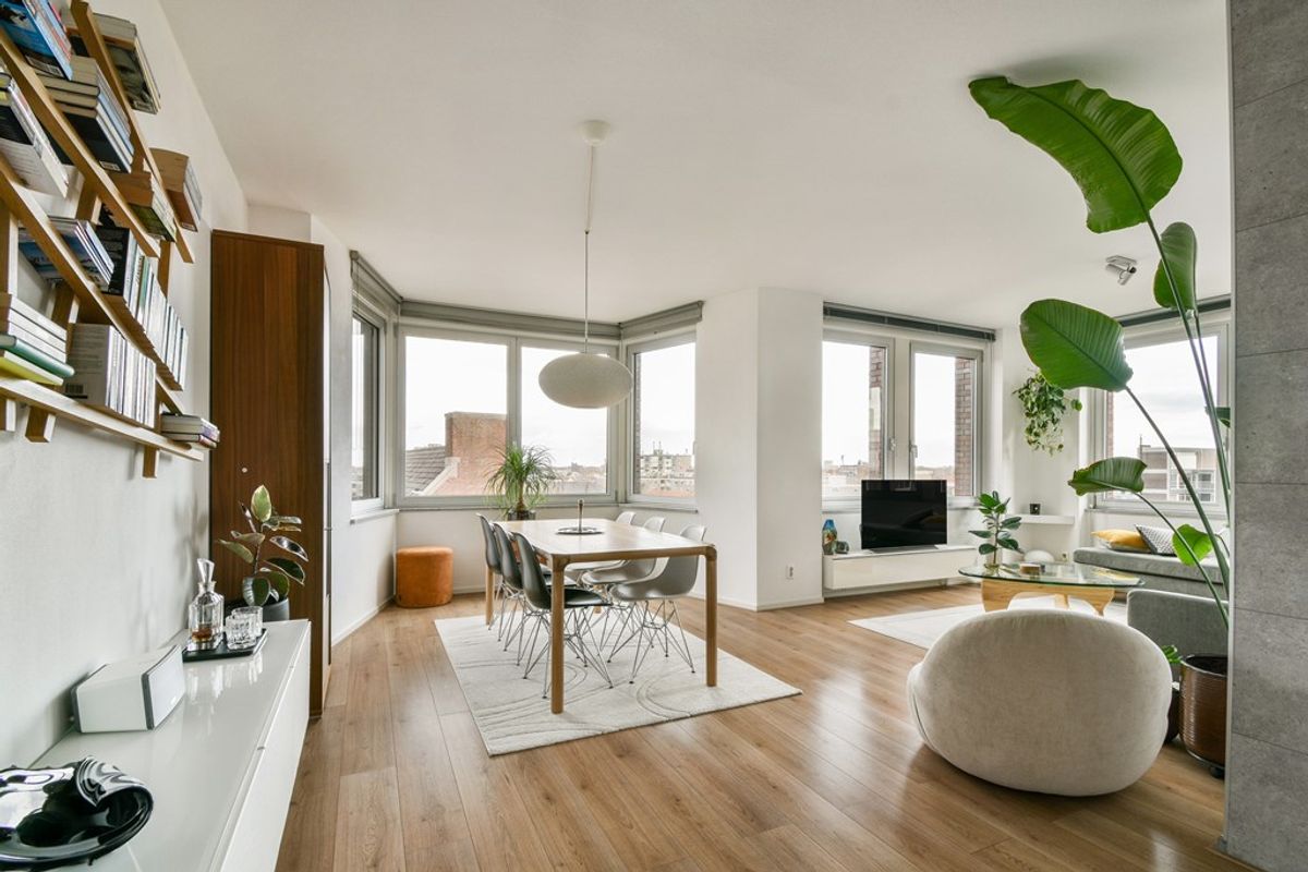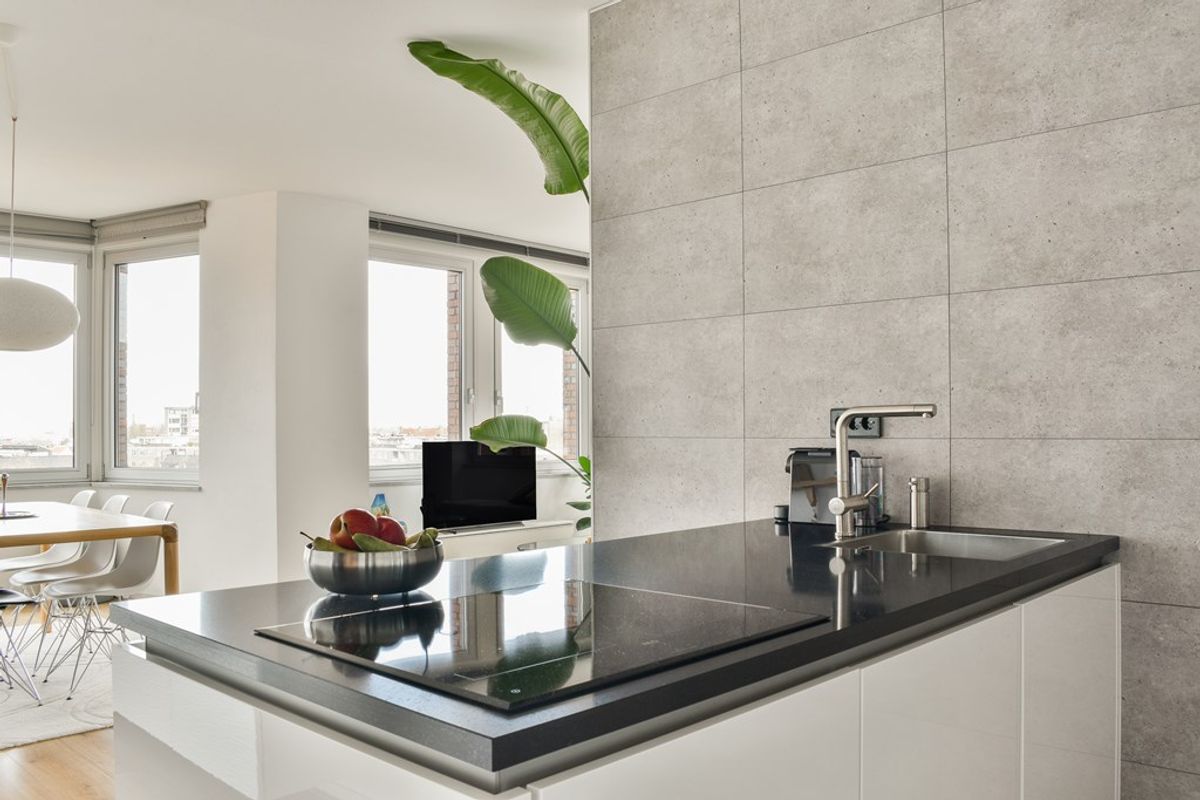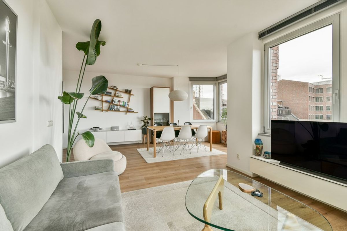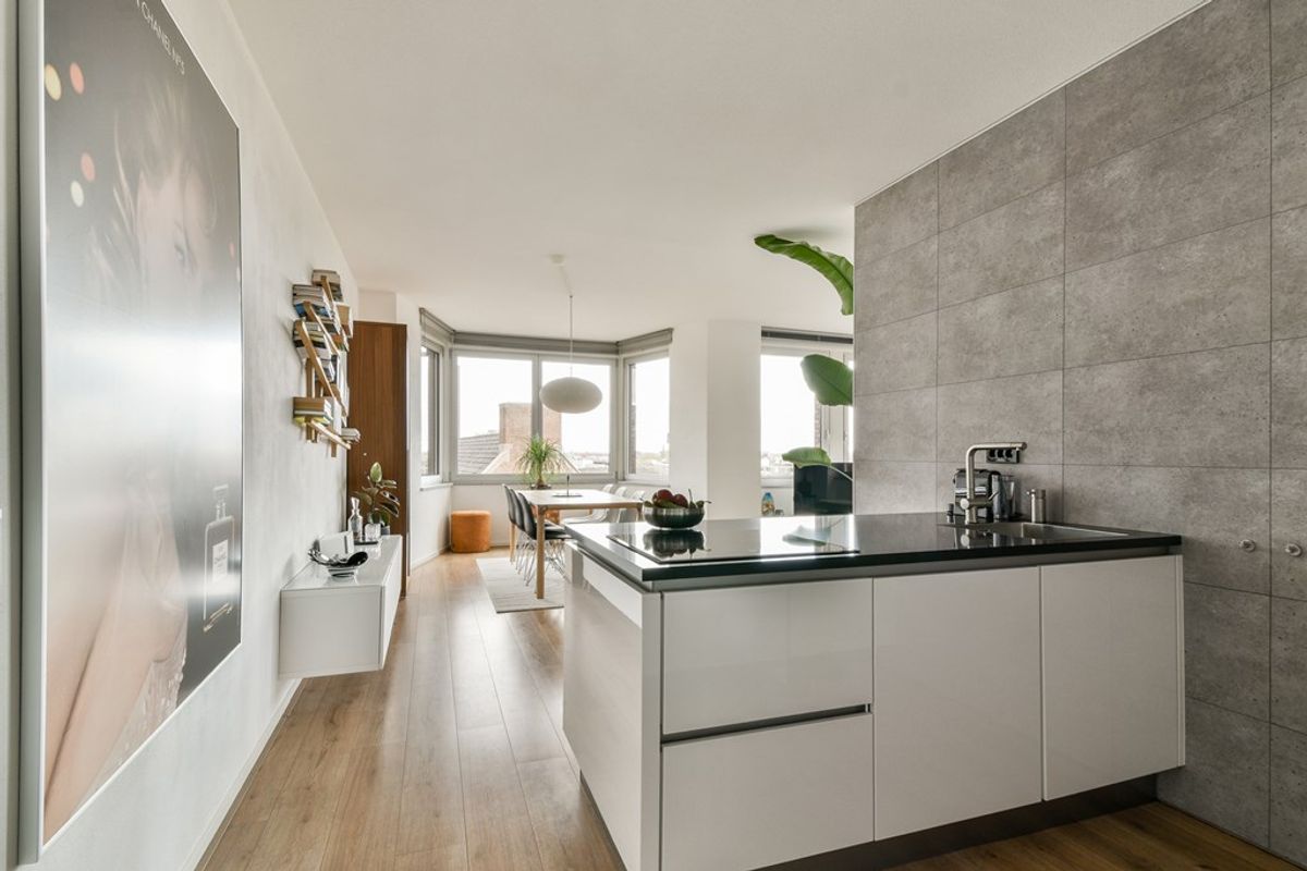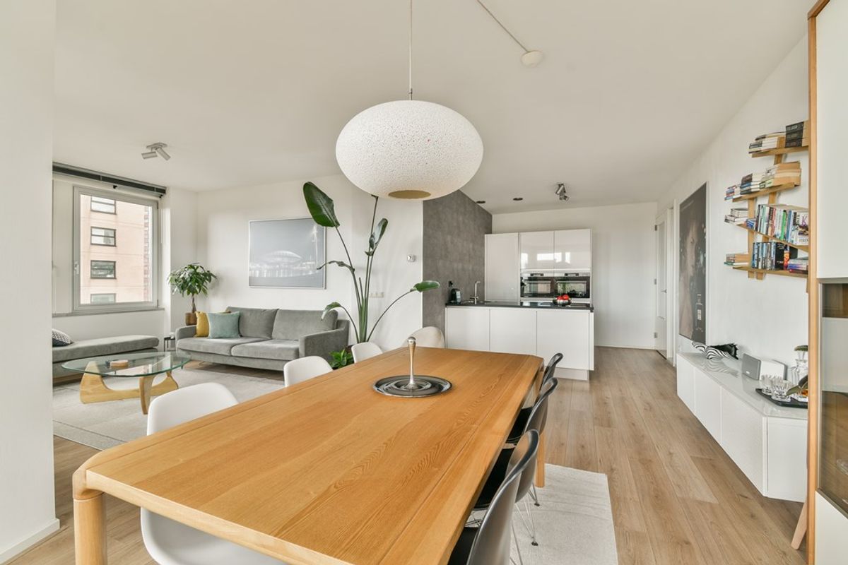 At the end of the hall is the spacious living room. The large windows immediately catch the eye, offering expansive views of the Maagd van Holland Quarter (and beyond!). The space offers space for a comfortable sitting area and a dining area with room for a large table. From here, you can easily stay in touch with everything happening in the open-plan kitchen.