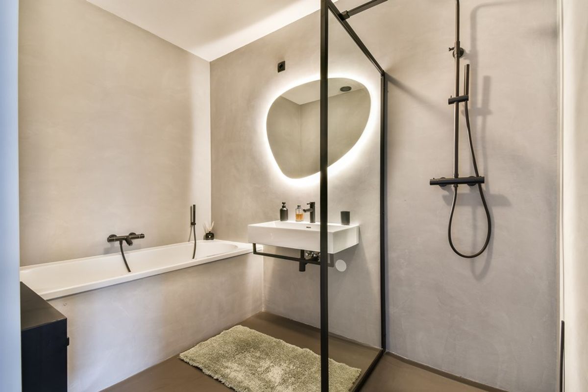 Direct aangrenzend is de comfortabele badkamer. Deze is in 2022 gemoderniseerd en is mooi en eigentijds afgewerkt, in dezelfde stijl als het toilet aan de hal. Er is een inloopdouche, een wastafel en een ligbad.